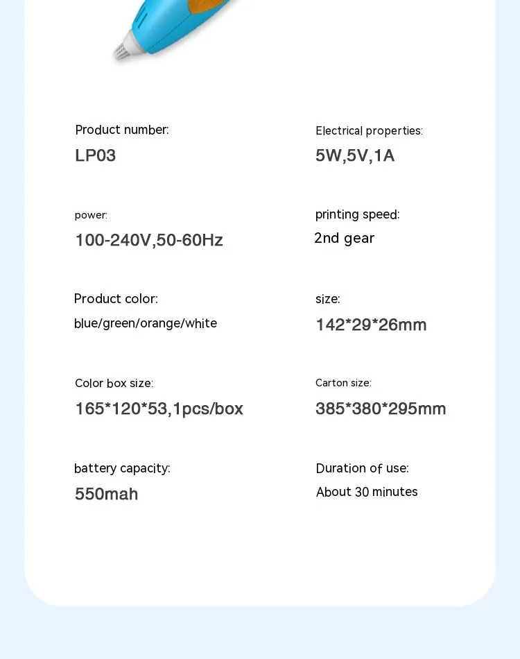 The wireless 3D pen is equipped with a long-lasting rechargeable battery, allowing for hours of uninterrupted creativity.