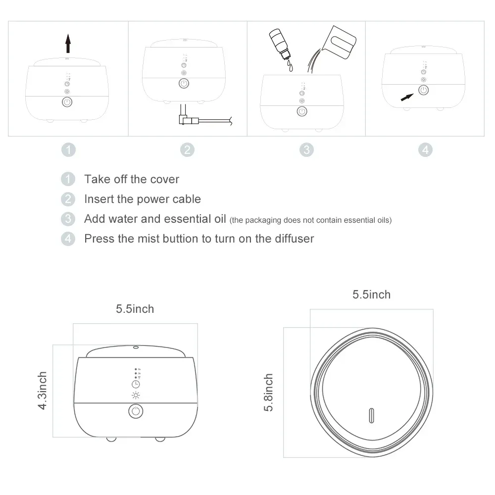 The main functions of the product are air purifier, colorful lights with adjustable color, humidifier, aroma diffuser, touch adjustment