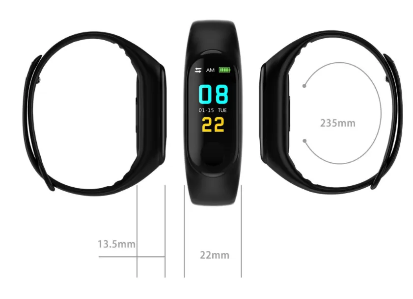 Main features: HD 0.96 color screen, colorful UI, heart rate monitoring, blood pressure monitoring, step counting, calories, distance, sleep monitoring, sports mode, call reminder, alarm reminder, hand-on bright screen, social sharing (WeChat, QQ, Facebook , Twitter, etc.