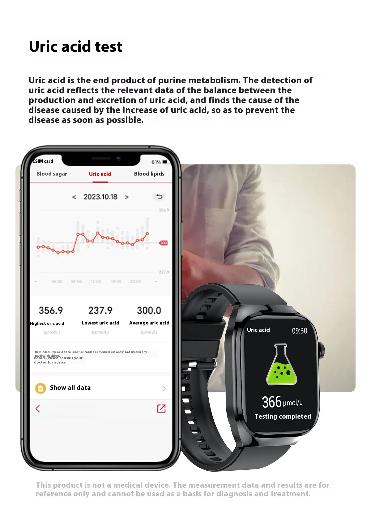 The Smart Watch Micro Physical Examination Uric Acid Blood Glucose Blood Lipid Bluetooth Calling is designed for individuals who prioritize health monitoring and convenience in their everyday life. With advanced features like uric acid, blood glucose, and blood lipid tracking, this smartwatch provides the insights you need to manage your health proactively.