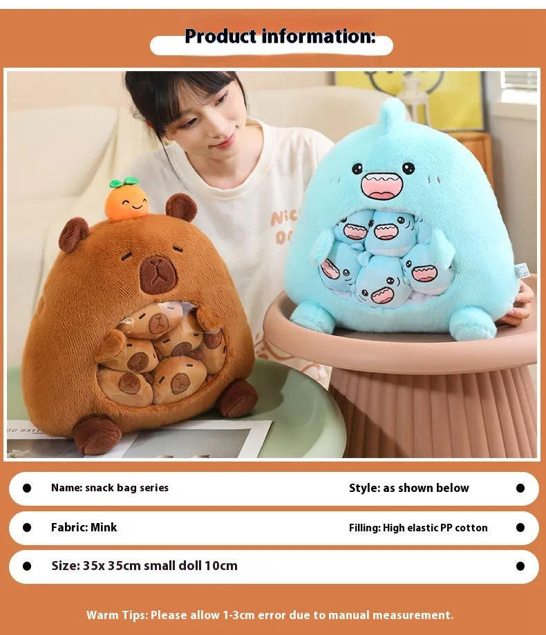 The Snack Bag Capybara Doll combines the lovable characteristics of capybaras with the practicality of a pillow, creating a multifunctional accessory that caters to both emotional and physical comfort. Its soft texture and ergonomic shape make it perfect for hugging, lounging, or using as a decorative accent. Let’s explore the key features and benefits of this delightful plush toy pillow.