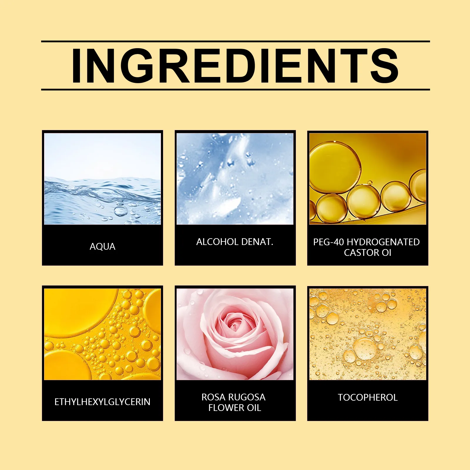 Ingredients: Water, PEG-40 hydrogenated castor oil, ethyl hexyl glycerin, rose oil, vitamin E
