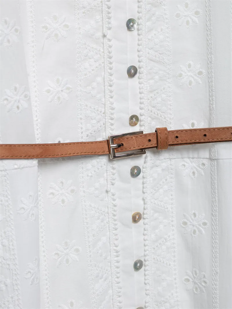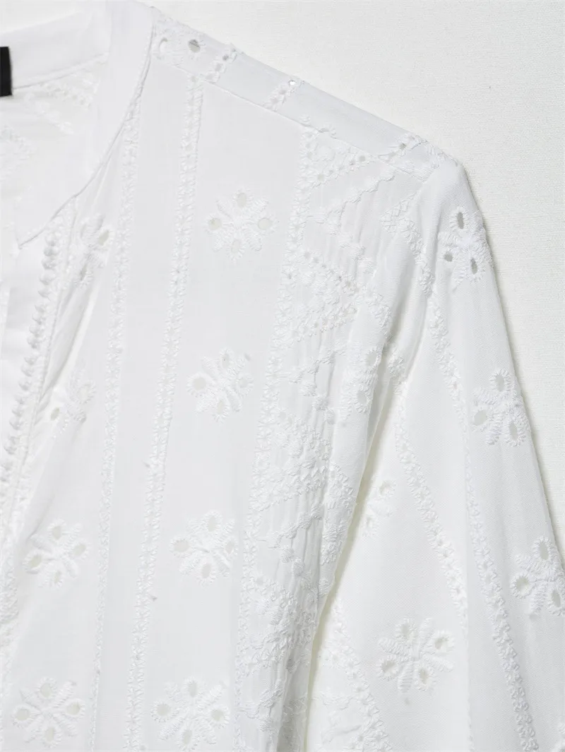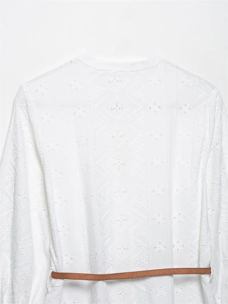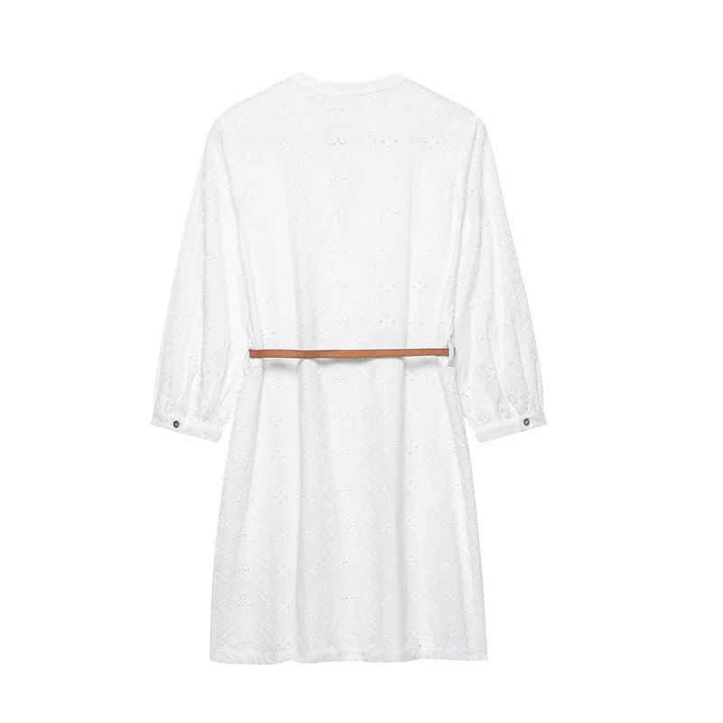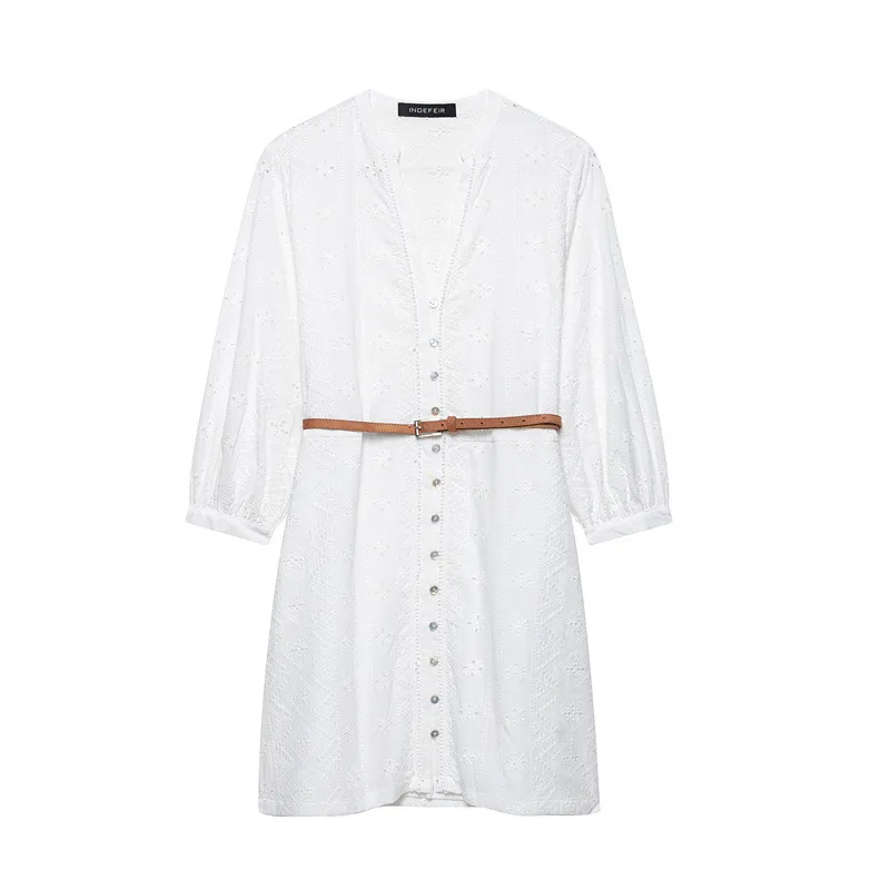 Made from premium fabric, this dress is not only visually appealing but also comfortable to wear. The hollow embroidery pattern creates a stylish contrast with the solid color, adding a touch of femininity and refinement. The dress’s versatile design ensures that it pairs well with a range of accessories, from heels to flats, and can easily transition from day to night.