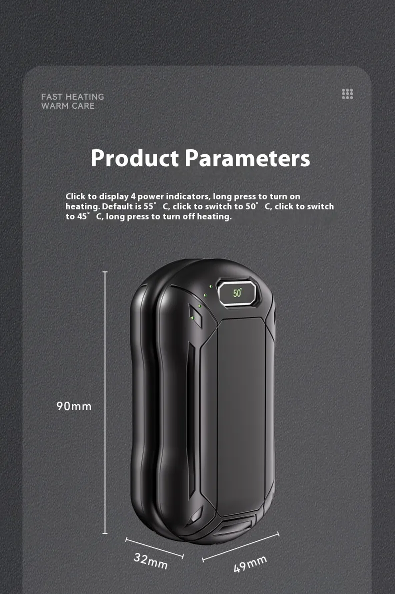 - 3 Adjustable Heat Level - The electric hand warmers take only 3 seconds to quickly heat up, and the 3 adjustable levels of temperature warms your both hands. You can adjust the temperature from 104°F to 140°F, Low temperature: 45°C (113°F). Medium temperature: 50°C (122°F), and high temperature: 55°C (131°F), the LED display screen shows the temperature.