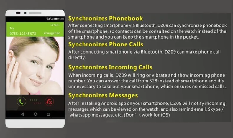 The Sports Smart Watch DZ09 is designed for individuals who want to stay active and connected. This multifunctional smartwatch combines phone capabilities, fitness tracking, and stylish design, making it the perfect accessory for fitness enthusiasts and tech-savvy users. Equipped with SIM card support and Bluetooth connectivity, the DZ09 allows you to make calls, send messages, and receive notifications right from your wrist, helping you stay informed and productive even when you're on the go.