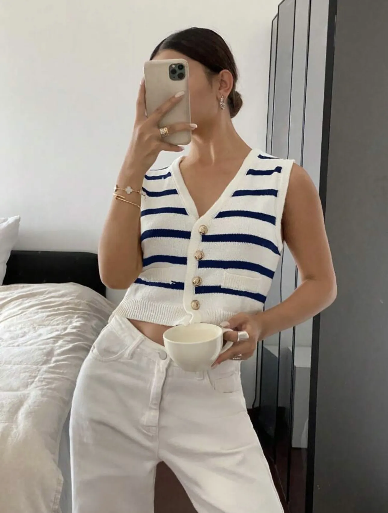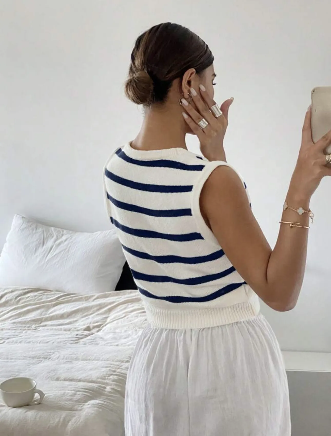 Knitted Striped Vest, Spring and Summer Striped Vest, Women's Striped Vest, European American Style Vest, Cross Border Foreign Trade Vest, Casual Knitted Vest for Women, Breathable Knitted Vest, Lightweight Striped Vest, Fashionable Striped Top for Women, Comfortable Summer Vest, Stylish Striped Vest for Layering, Global Fashion Vest, Versatile Striped Vest, Women’s Fashion Knit Vest, Striped Knit Top for Summer.