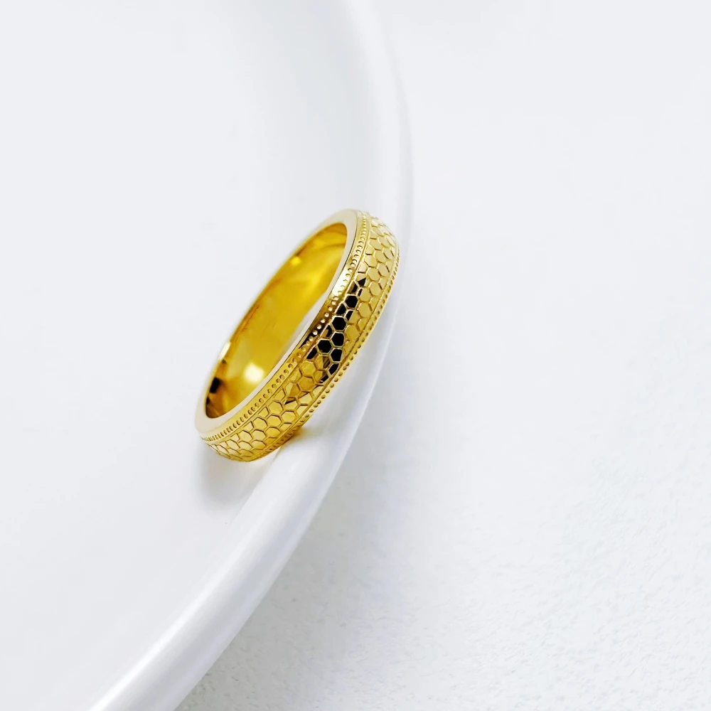With its sleek gold color, honeycomb design, and durable construction, this ring has a timeless, yet modern, appeal. It’s perfect for those who appreciate clean lines and contemporary design while also valuing longevity and strength in their jewelry.