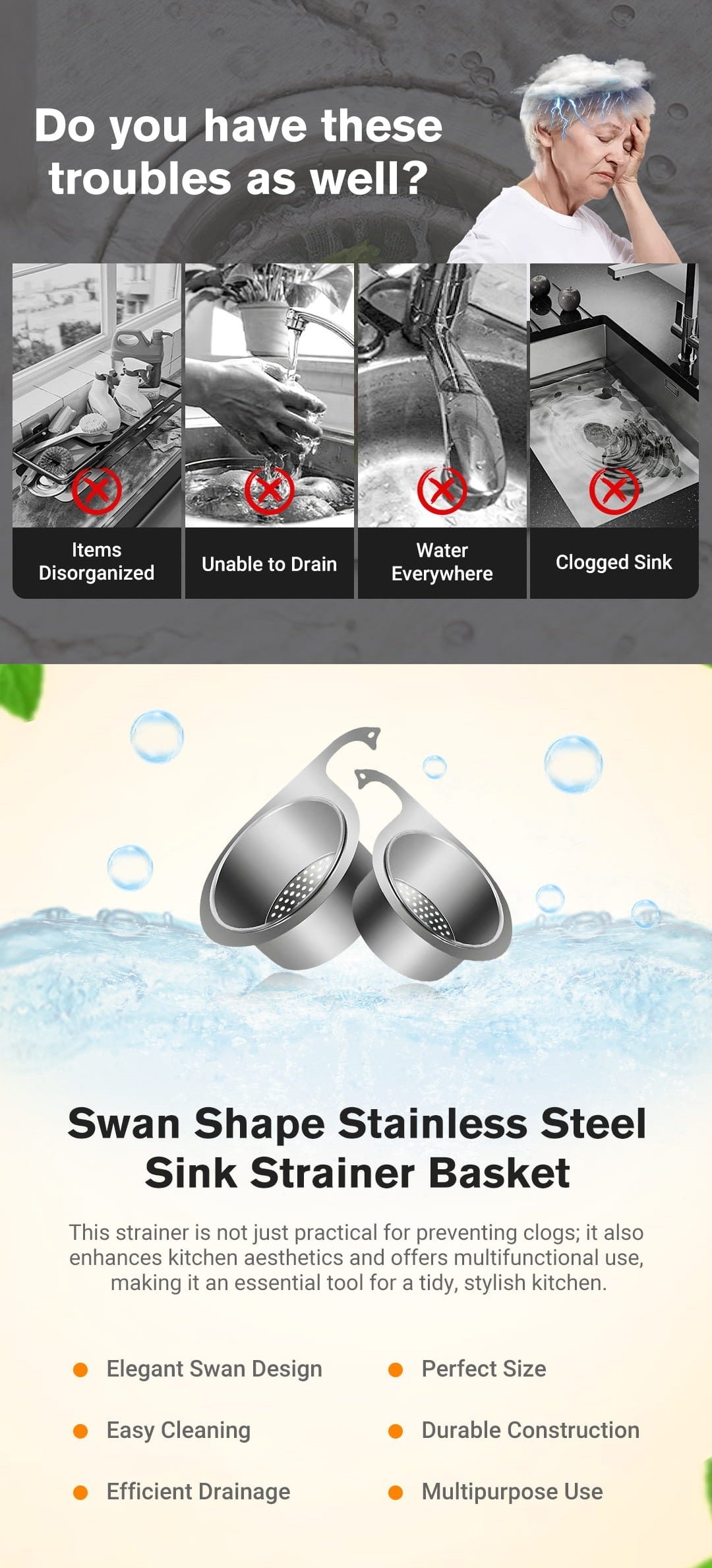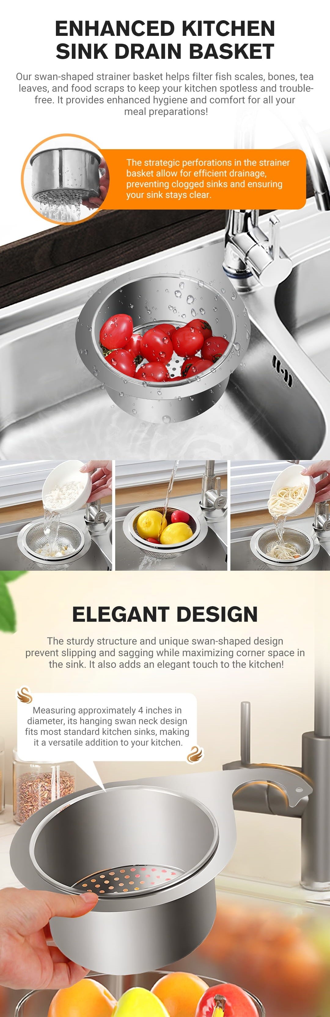 Multifunctional sink drain basket has a wide range of uses: The kitchen sink drain basket swan drain rack can filter food and sundries, and can avoid of fish scales, fish bones, tea residues, leftovers etc to blocking the sewer. swan drain basket for kitchen sink making your life happier and warmer.