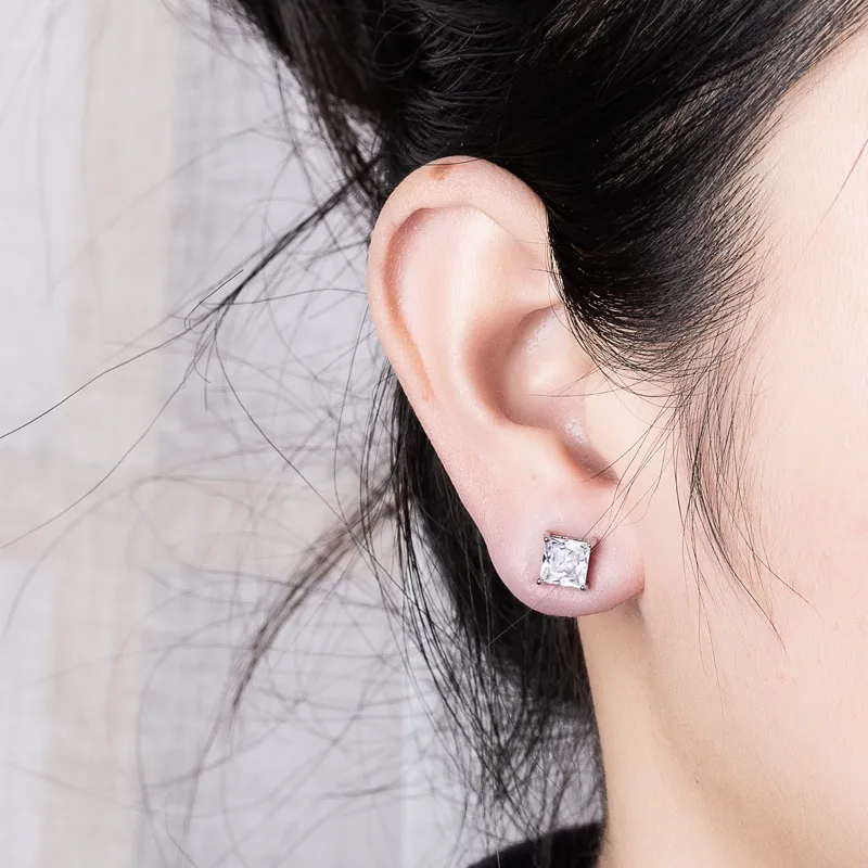 These Sterling Silver Needle Four-Claw Square Stud Earrings Inlaid with Diamond Moissanite are the epitome of luxury and elegance. Featuring precious moissanite stones set in a four-claw square design, these stud earrings offer an affordable yet dazzling alternative to diamonds. The use of sterling silver ensures durability, while the moissanite stones provide exceptional brilliance and fire, making these earrings a stunning addition to any jewelry collection. Perfect for both everyday wear and special occasions, these earrings are designed to stand out with their timeless sparkle.