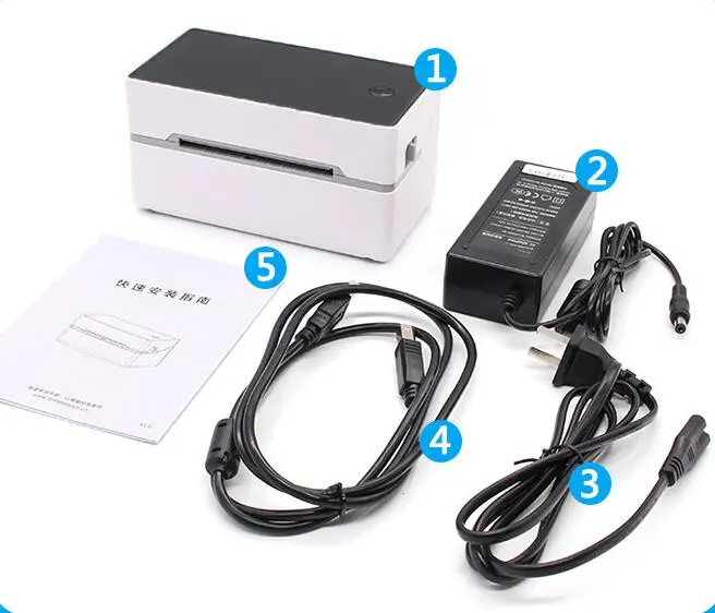 1: Printer 2: Adapter 3: Power cord 4: USB data cable 5: Instructions