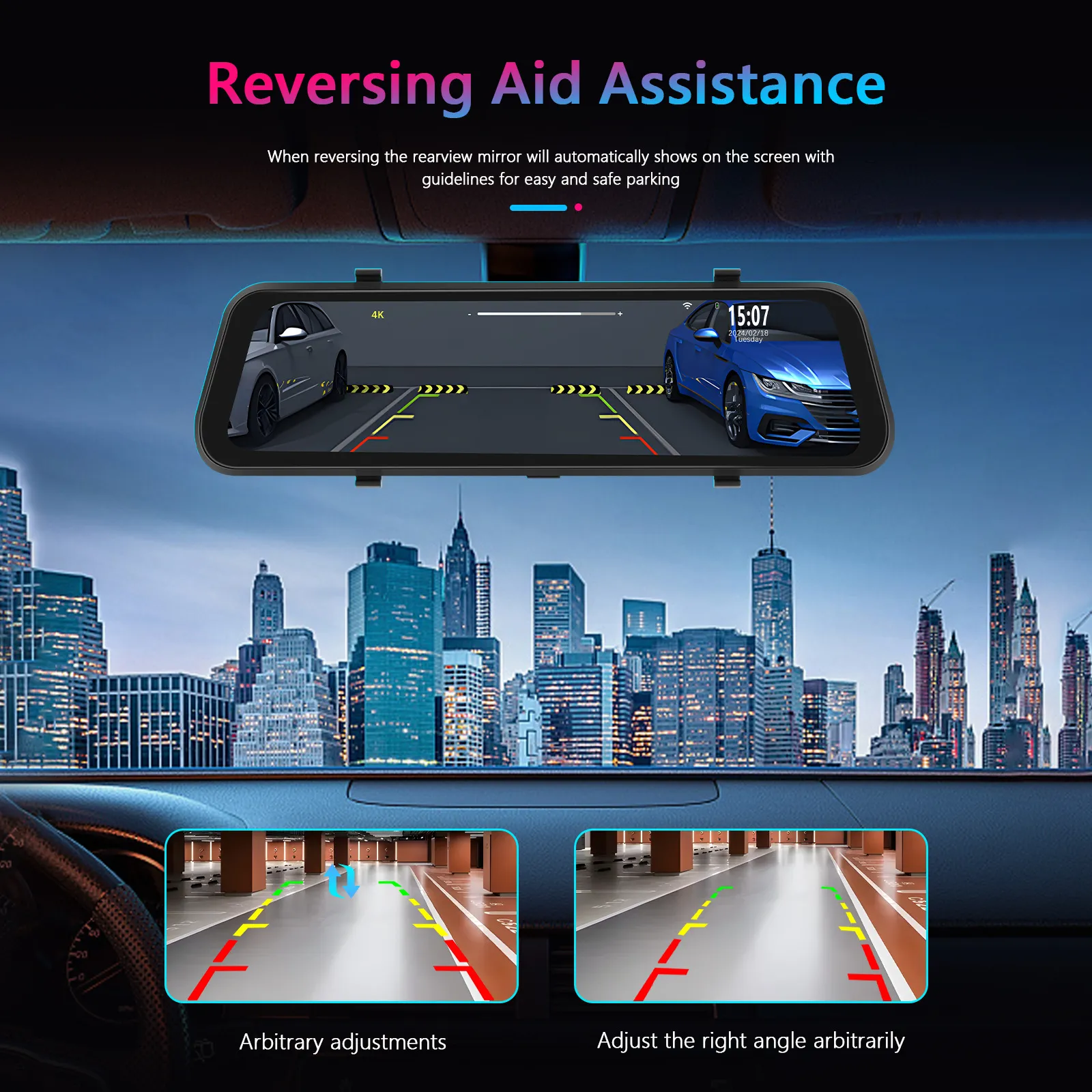 The large, high-definition touch screen replaces your traditional mirror, offering a clear and real-time view of your surroundings, even in low-light or adverse weather conditions. The 4K front camera delivers crystal-clear recordings, capturing every detail of your journey for added security and evidence in case of an accident. Additionally, the device integrates a high-resolution rearview camera that provides a wide-angle perspective for safe parking and reversing.
