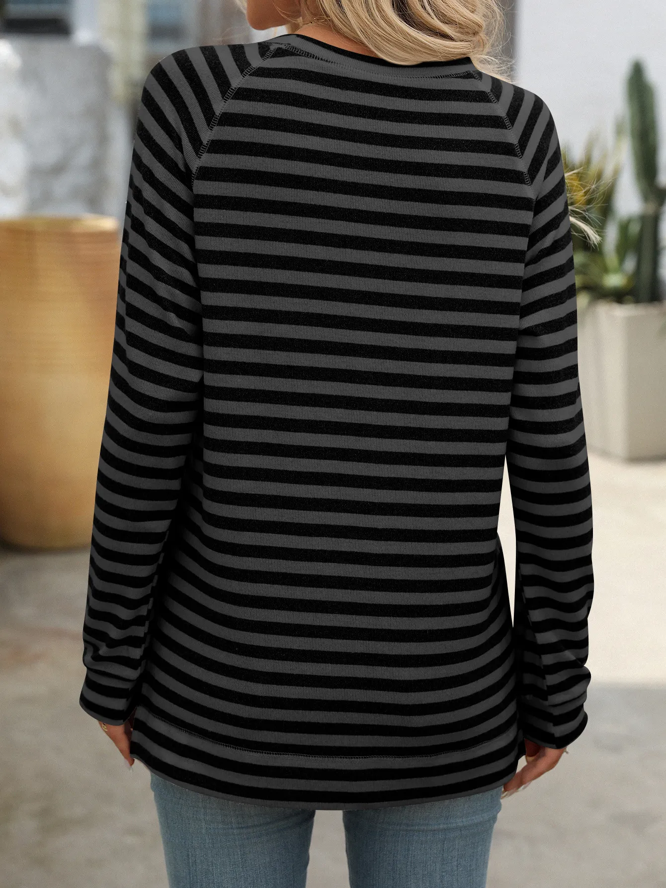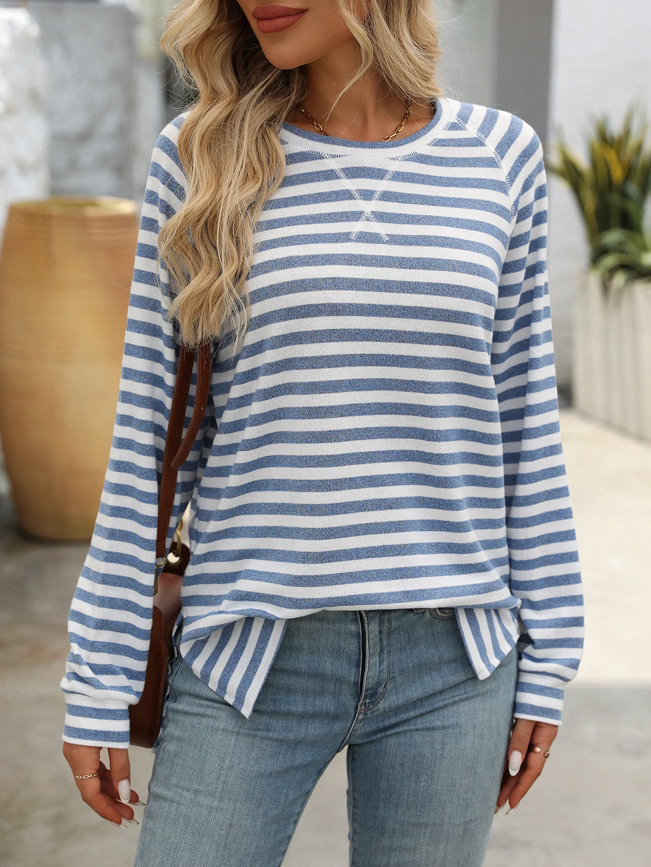 Striped Contrast Color Round Neck Long Sleeve Loose-fitting T-shirt Top