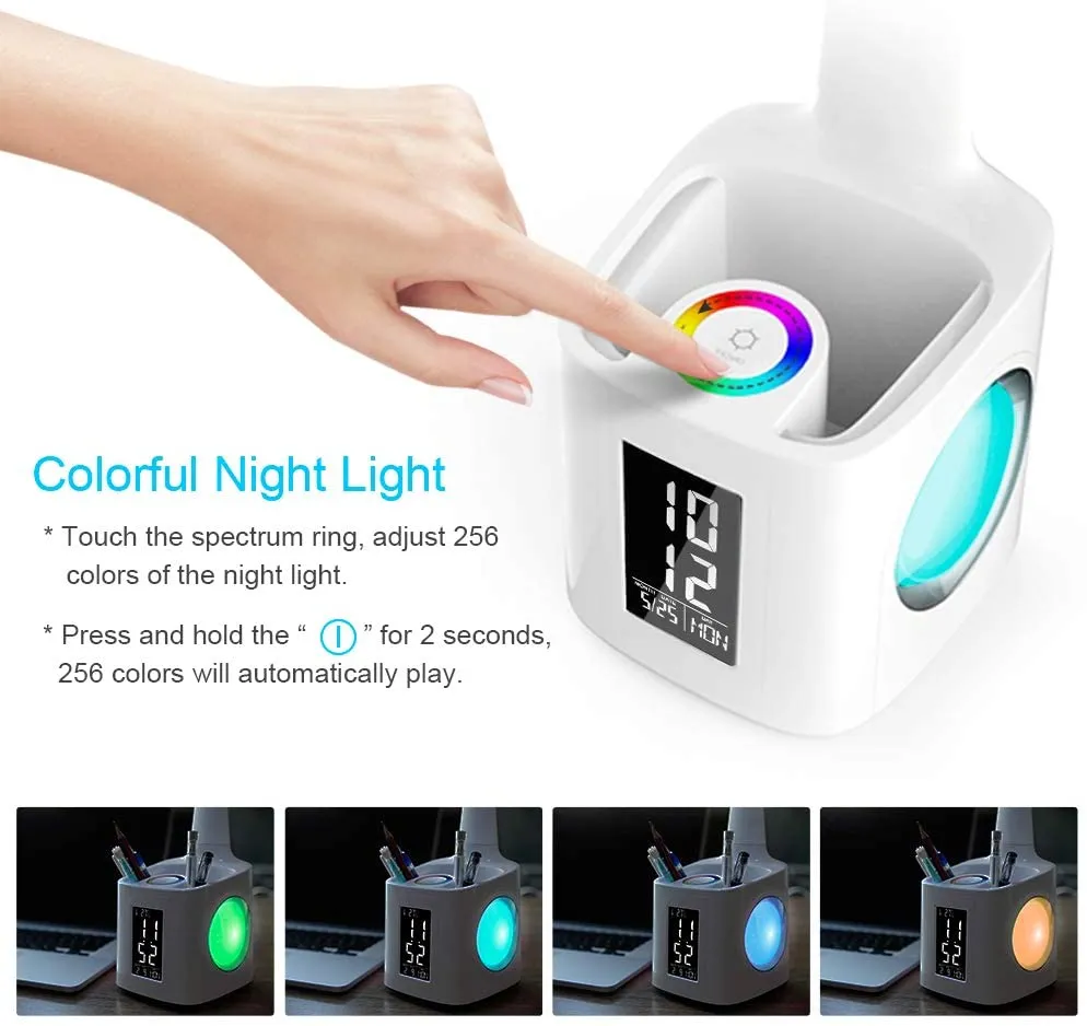 2. Multifunction: 7 in 1, desk lamp with USB charging port, 256 color-changing base, pen holder, clock, calendar and LCD screen to meet all
