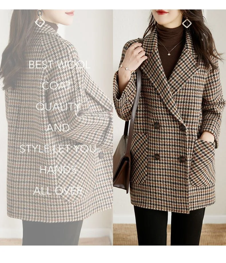 This woolen coat is designed not only to keep you warm but also to serve as a stylish statement piece. With its suit collar, double-breasted buttons, and sleek design, it offers an elegant way to stay cozy in colder weather. The houndstooth wool coat also features pockets, adding functionality and convenience to its fashionable design.