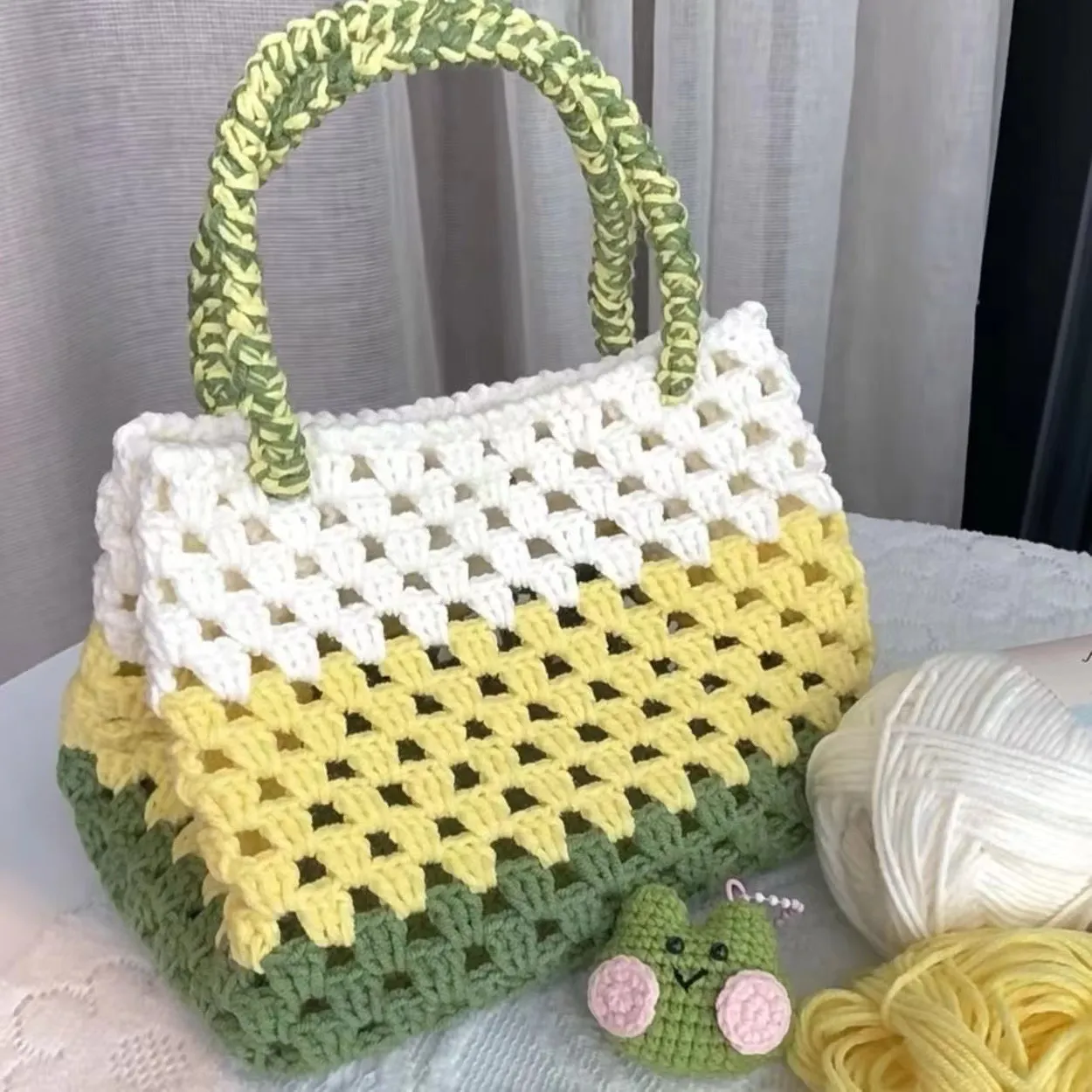 The Summer Contrast Color Wool Handbag - Hollow Out Elegance is the perfect accessory for those who want a chic yet functional piece to accompany their summer outings. Featuring a unique hollow-out design and vibrant contrast colors, this bag is ideal for beach trips, casual get-togethers, or adding a pop of color to your everyday look.