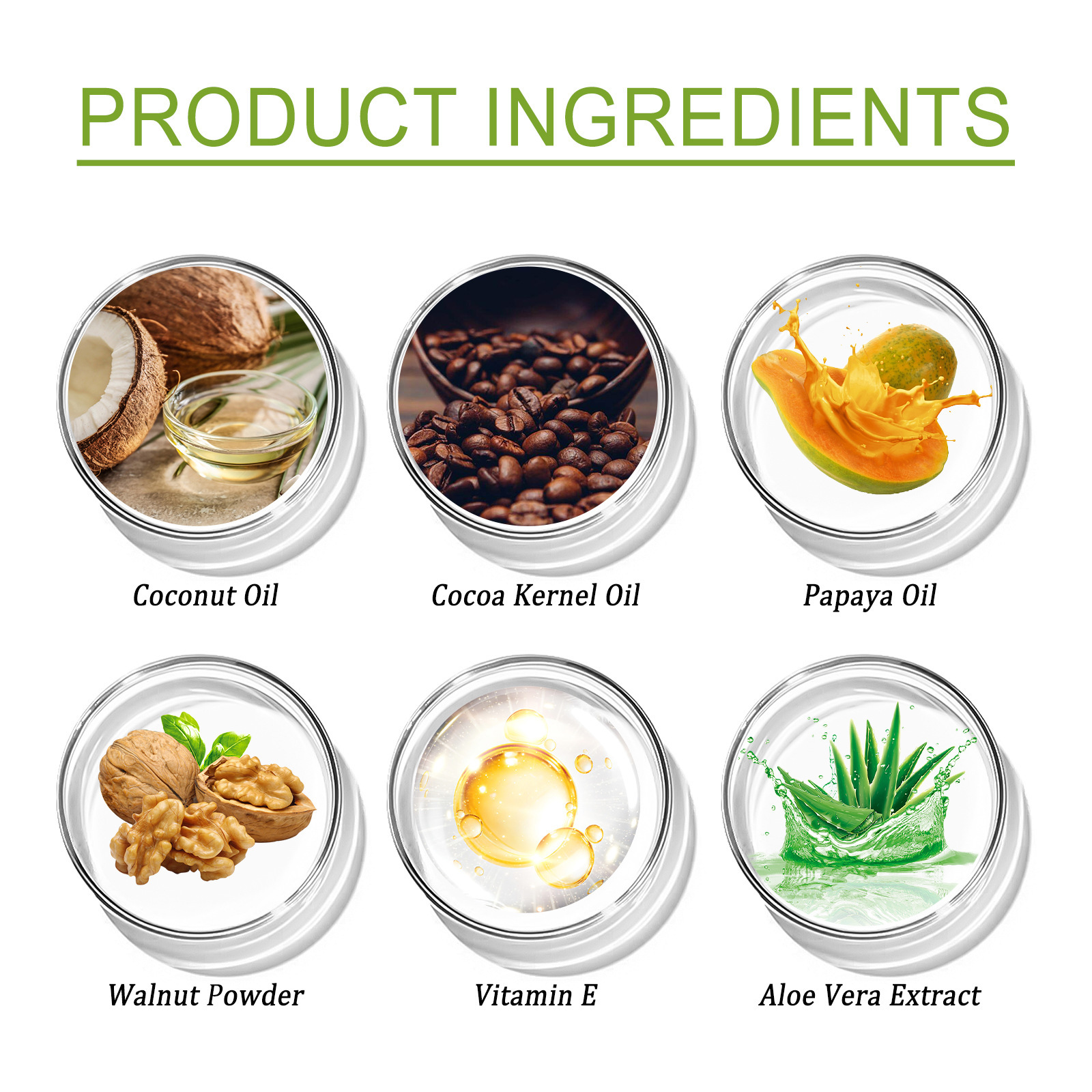 Ingredients: coconut oil, cocoa seed oil, papaya oil, walnut powder, vitamin E, aloe extract
