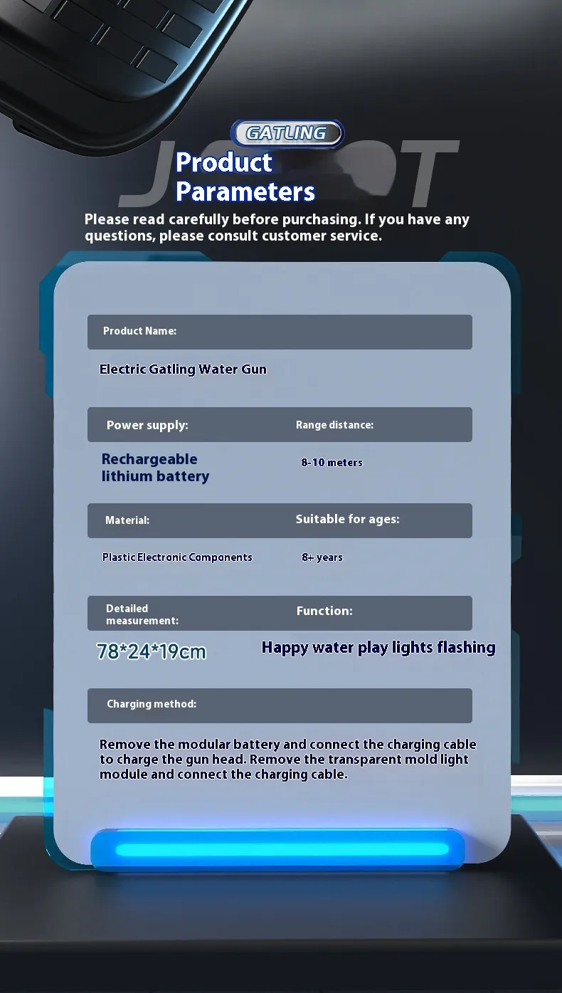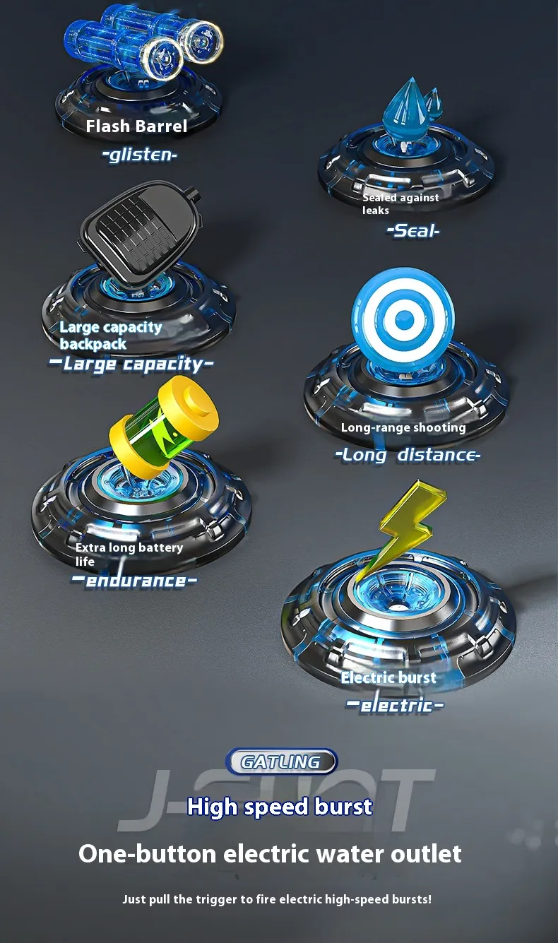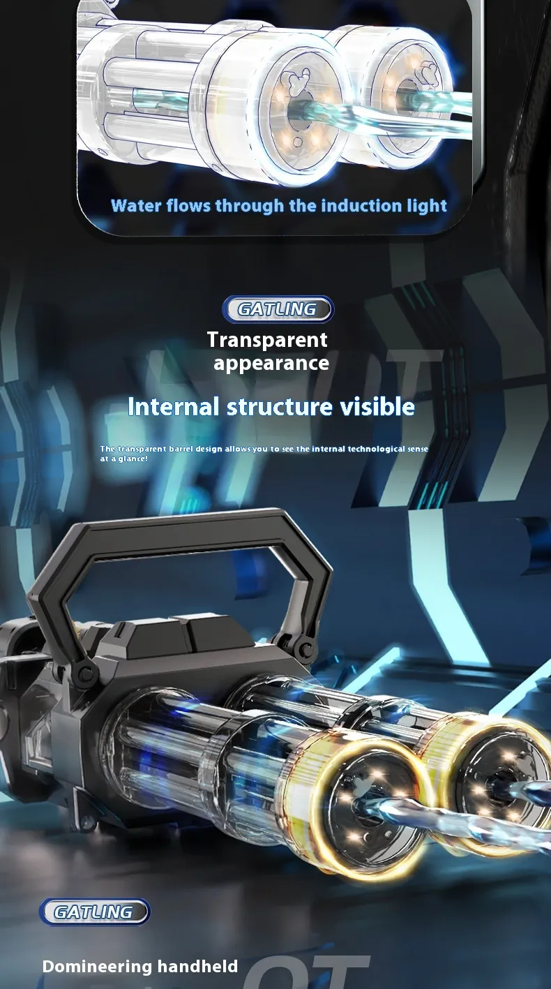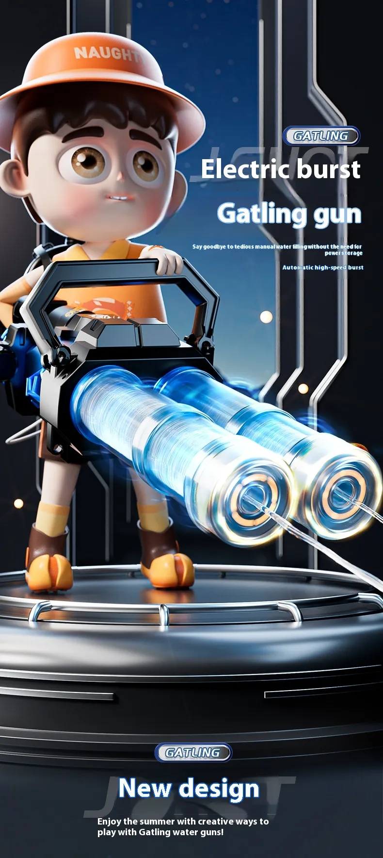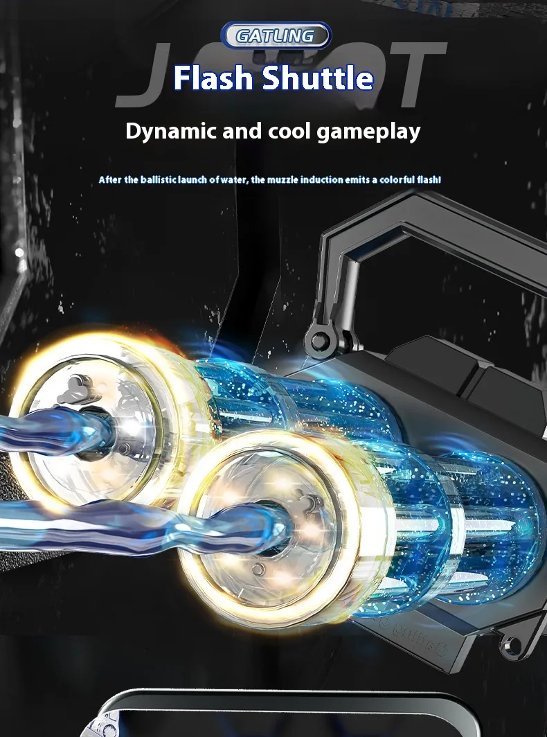 This electric Gatling water gun is designed to deliver powerful, continuous blasts of water, giving players an advantage in any water fight. Unlike traditional water guns that require manual pumping, this electric model offers effortless play, letting users focus on their aim and strategy. The steady water stream and long-range capabilities make it easy to soak opponents, adding excitement to every spray.