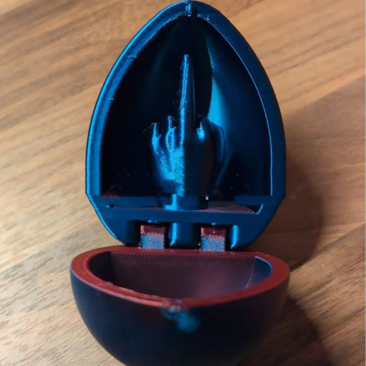 - Design: An egg-shaped container that holds a hidden middle finger, ready to surprise