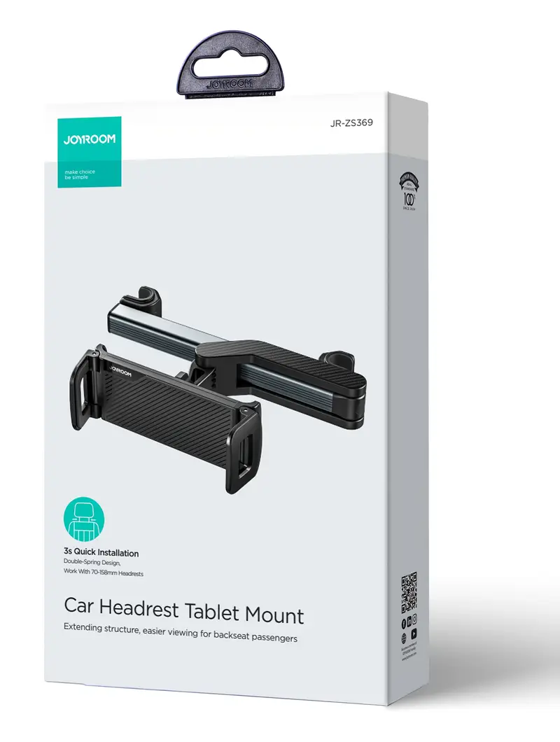 Warning: Please observe the laws, regulations and safety requirements of your country/region when installing and using this item to avoid interfering with law enforcement, other traffic participants or traffic safety.The Joyroom JR-ZS369 is a multifunctional holder suitable for iPads and tablets, featuring simple one-handed use, 360° rotation, and a stable setup on headrests measuring 70-158mm.The dual-shaft extending design allows back seat passengers to see more easily. It has a quick installation process thanks to its double-spring mechanism. The product is designed for user convenience, enabling operation with just one hand. It can rotate 360 degrees, providing various angle adjustments. It is compatible with iPads and tablets, fitting headrests between 70-158mm and devices ranging from 4.7 to 13 inches. Made from premium materials, it features a sand-blasted aluminum main rod, a carbon fiber texture, and a recyclable clamp arm, ensuring safety.