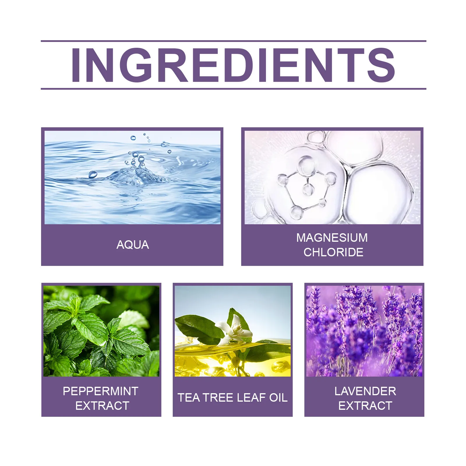 Ingredients: Water, lavender extract, magnesium chloride, mint extract, tea tree oil