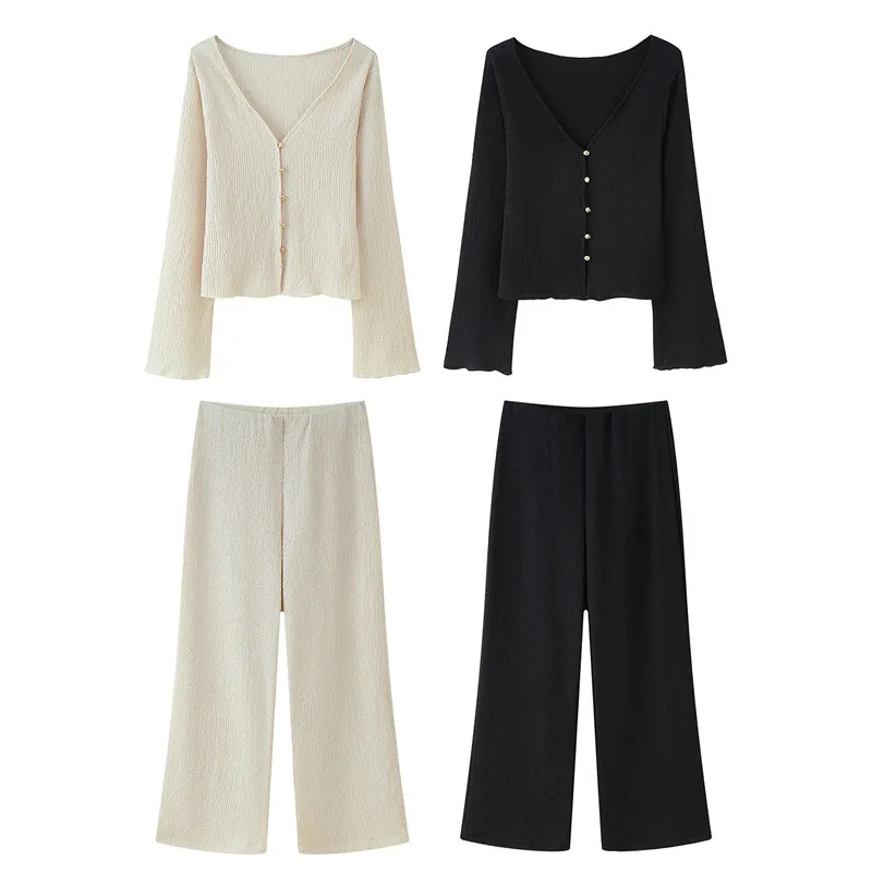 Texture Sense V-neck Long Sleeve Top Baggy Straight Trousers Suit