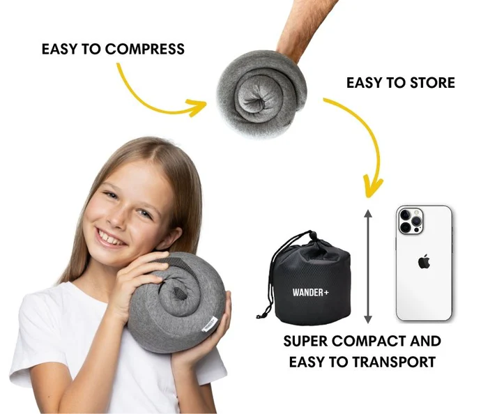 The WANDER+ Kids Pillow is designed with children’s comfort in mind, with a smaller size and ergonomic shape that provides the perfect fit for little necks and heads. It’s tailored to offer proper support, ensuring your child remains comfortable throughout the trip, whether they’re resting in the car, on a plane, or at home.