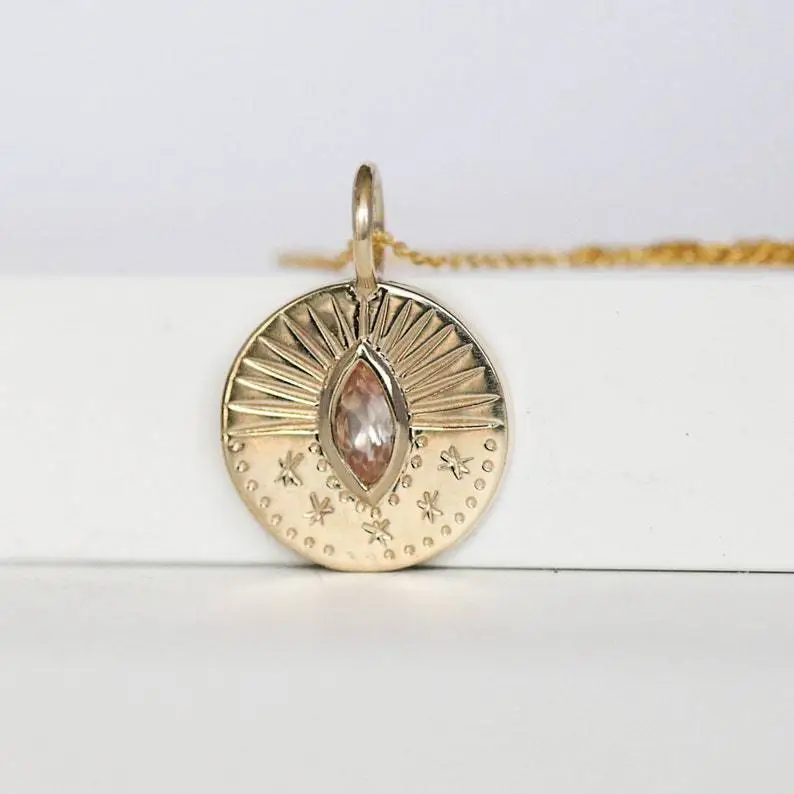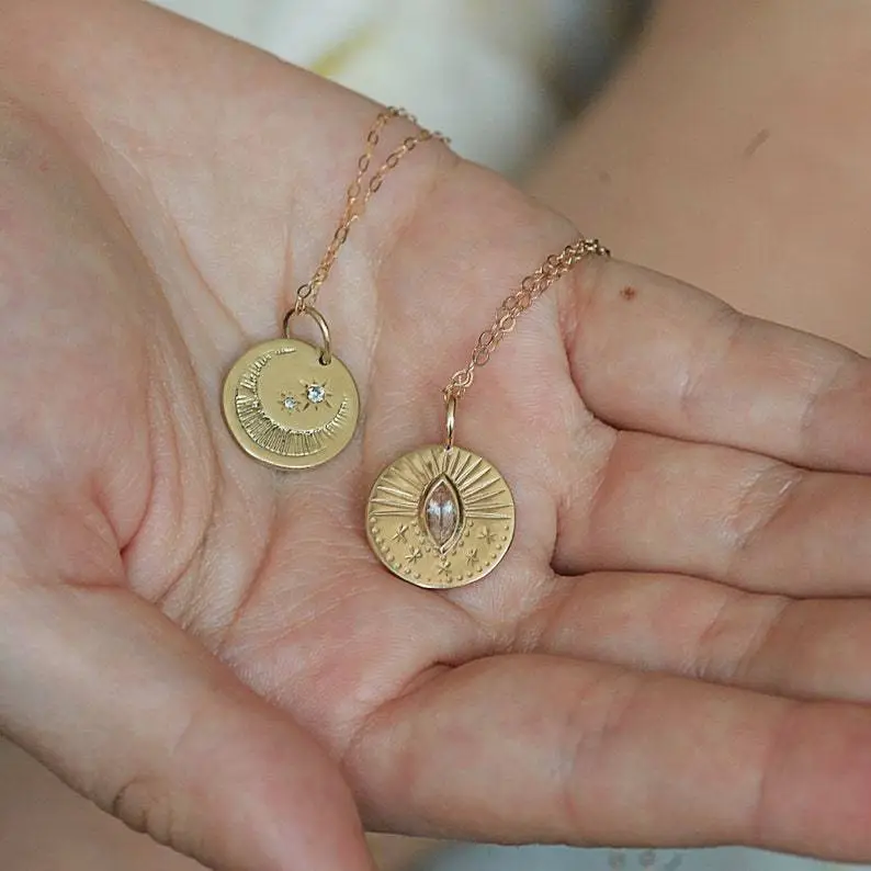 - Round Coin Pendant: Classic shape enhanced with intricate celestial patterns.