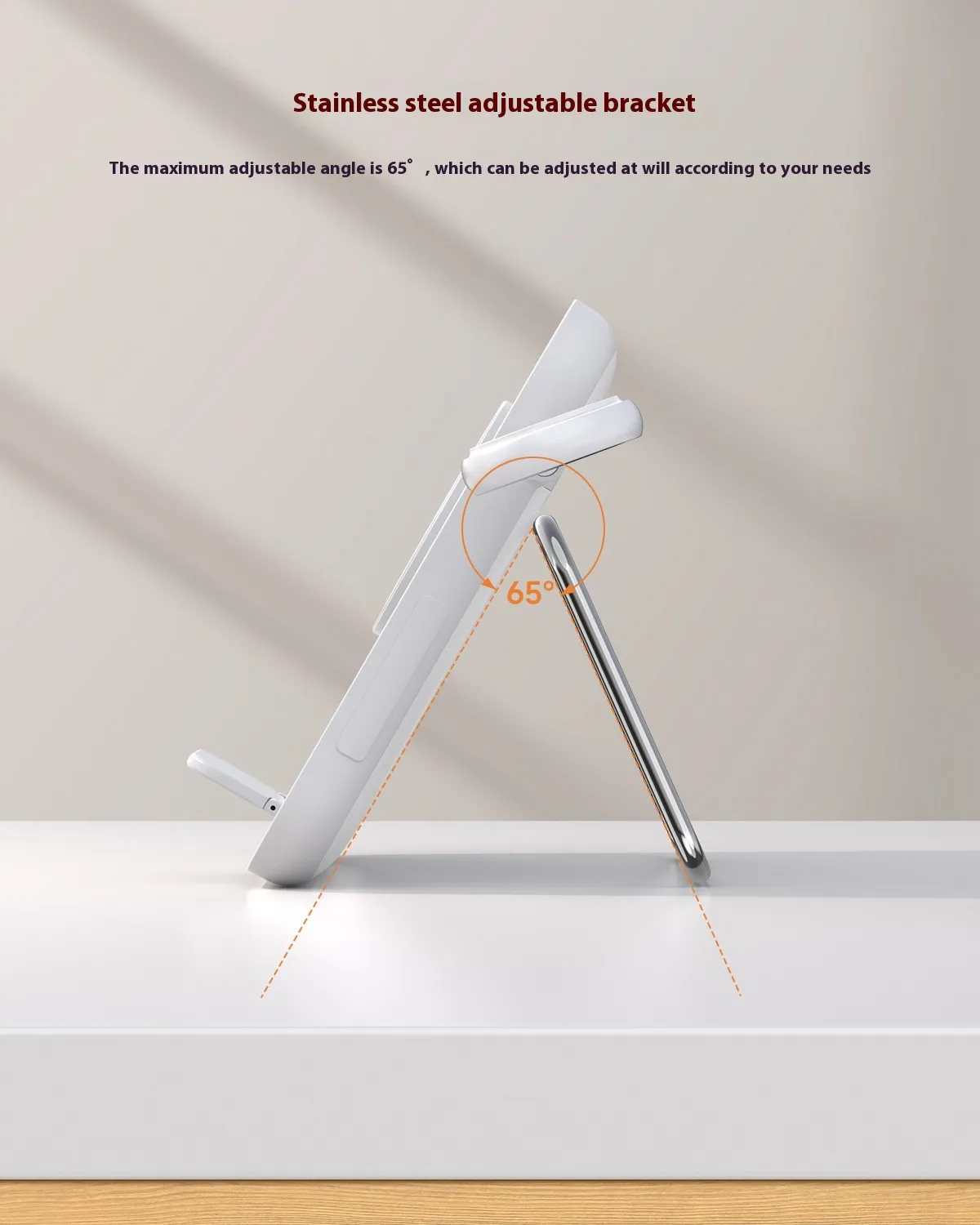 This multi-functional desk lamp is perfect for anyone who needs a combination of makeup mirror, RGB lighting, task lighting, and wireless charging in one compact device. Whether you're getting ready in the morning, working late at your desk, or winding down with ambient light in the evening, this lamp can handle it all. The stainless steel holder ensures a stable and stylish setup, making it a must-have for any vanity or workspace.