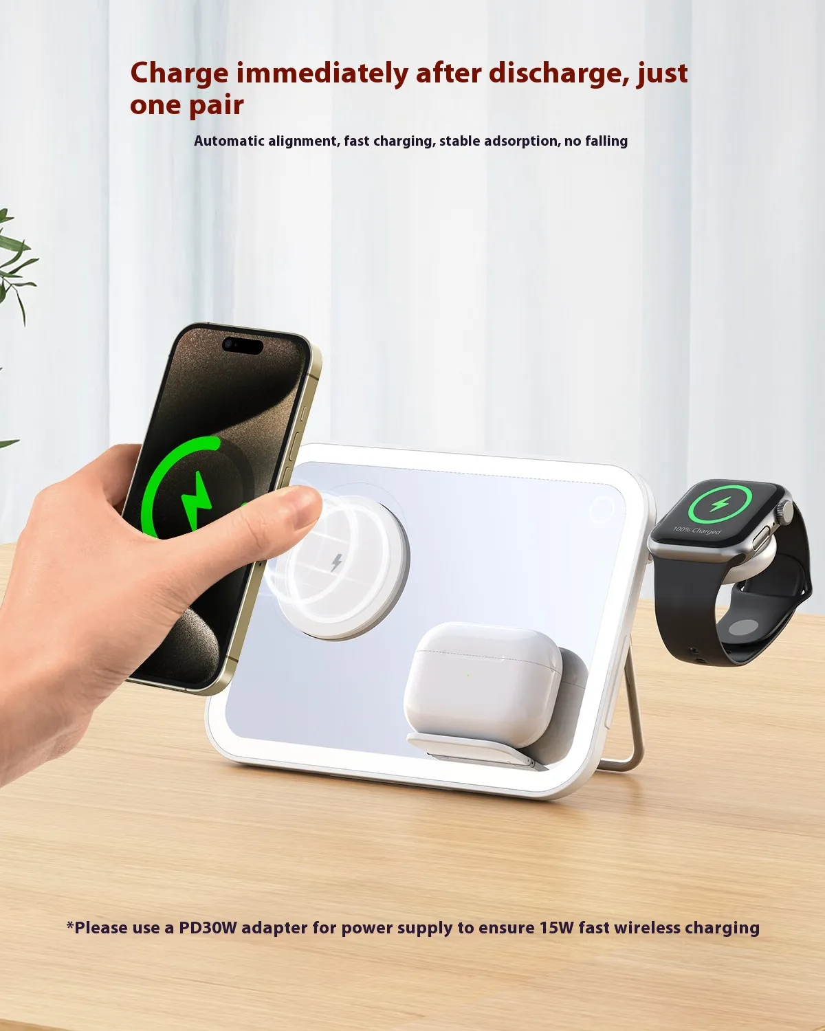 Three-in-1 Wireless Charger LED Makeup Mirror RGB Small Night Light Four-in-One Desk Lamp Charging Stainless Steel Holder