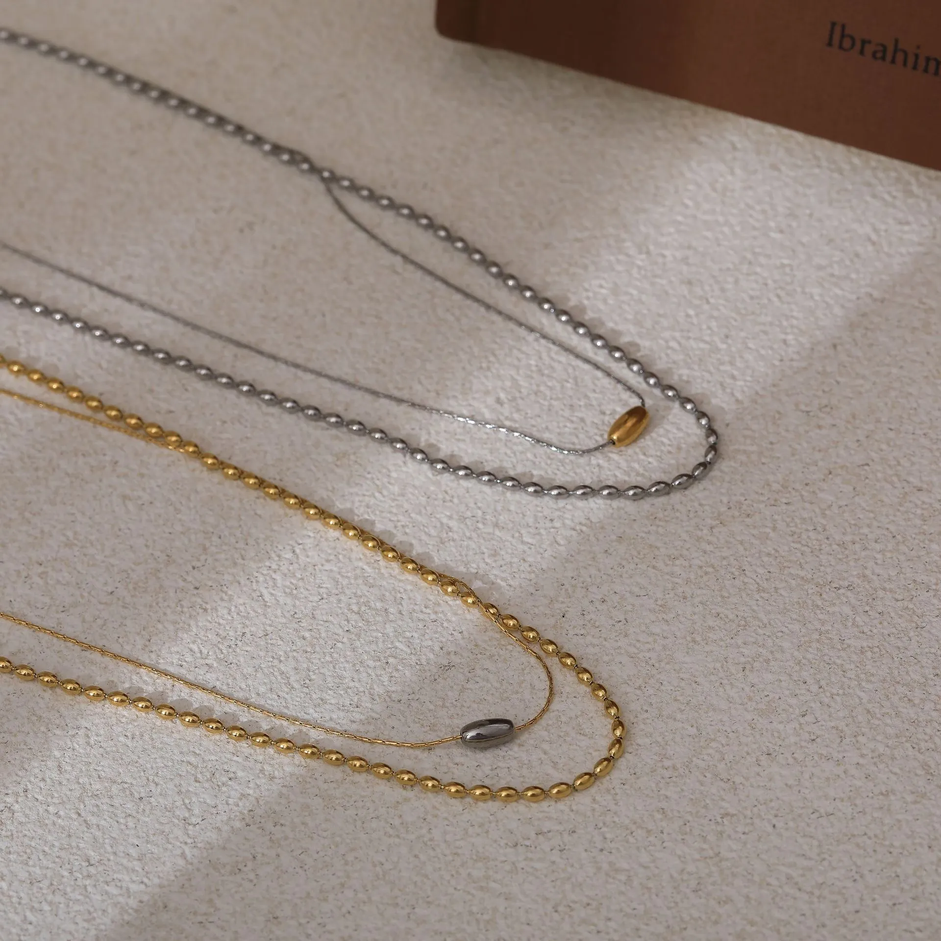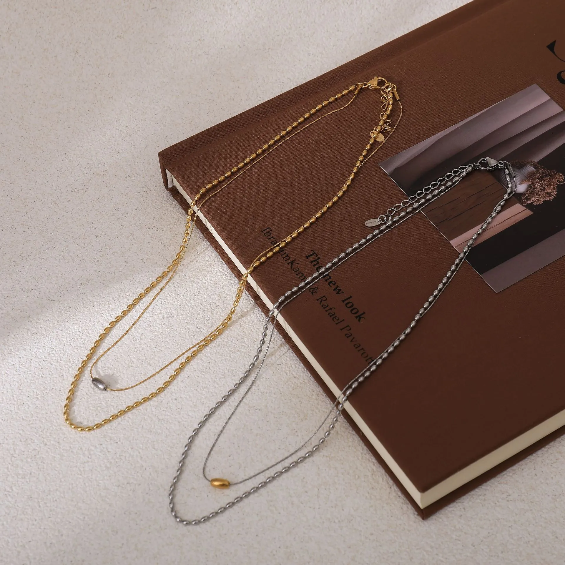 The Titanium Steel Gold Rice Grain Double-layer Contrast Color Necklace is a sophisticated and versatile accessory