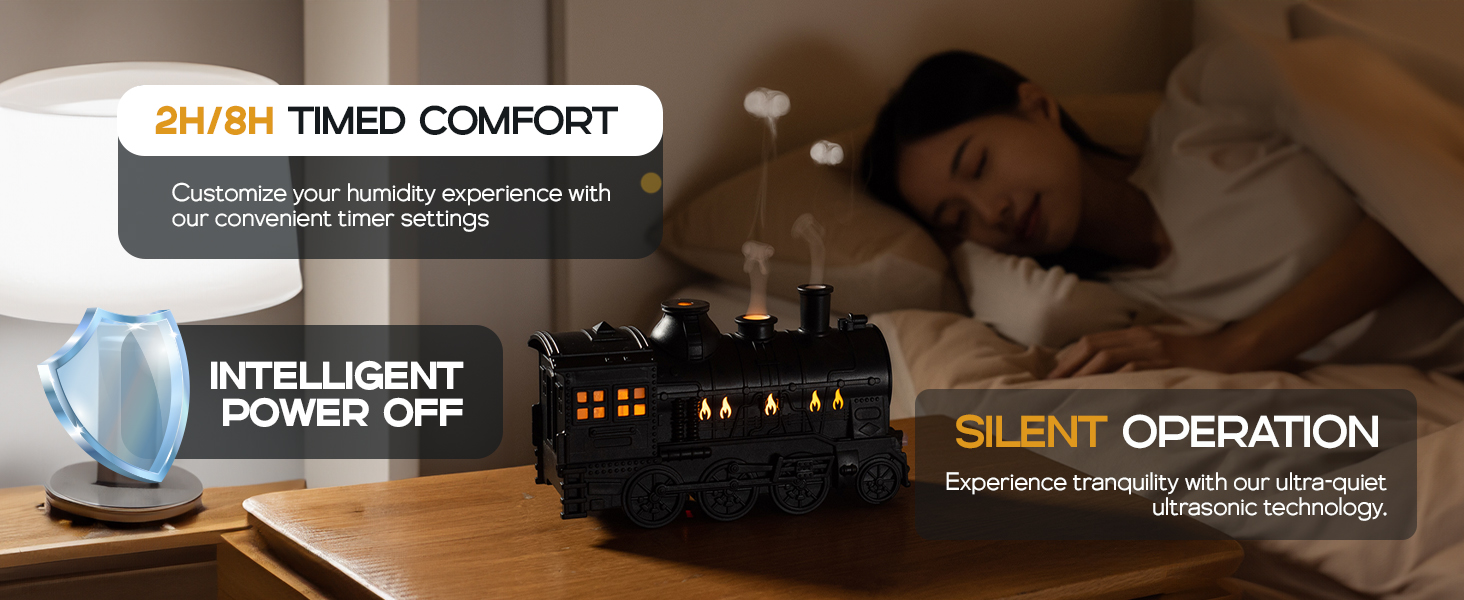 - ULTRA QUIET OPERATION: The ultrasonic train humidifier runs silently (<25dB) with dual mist outlets and a 300ml tank; Perfect for bedrooms, living rooms, offices, and large rooms, nourishes body and mind, relieves stress and improves sleep quality