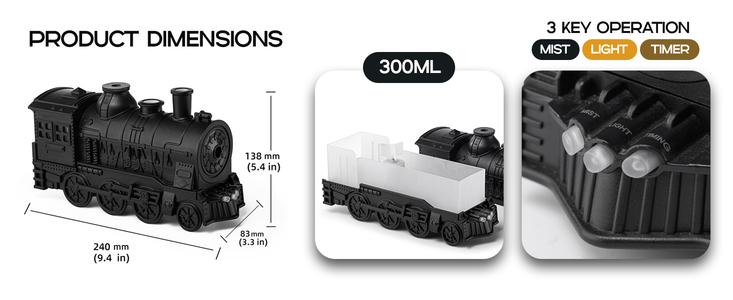 - Train Design: The desktop humidifier adopts a train shaped design with a classic black fashionable color scheme, giving it a high end and stylish appearance. It is the perfect gift choice for family and friends.