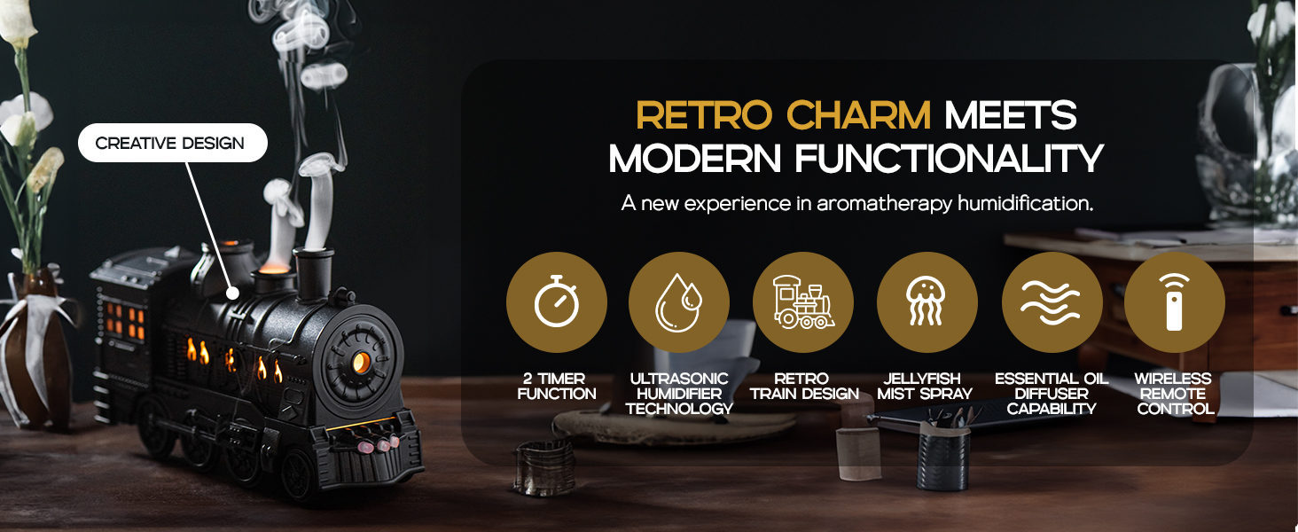 - Retro Style Design: OMEO Black, Gold, Silver Small Train Humidifier blends nostalgic charm with modern functionality, offering a unique retro look that brings back the feel of old times. Perfect decor piece with added aromatherapy benefits.