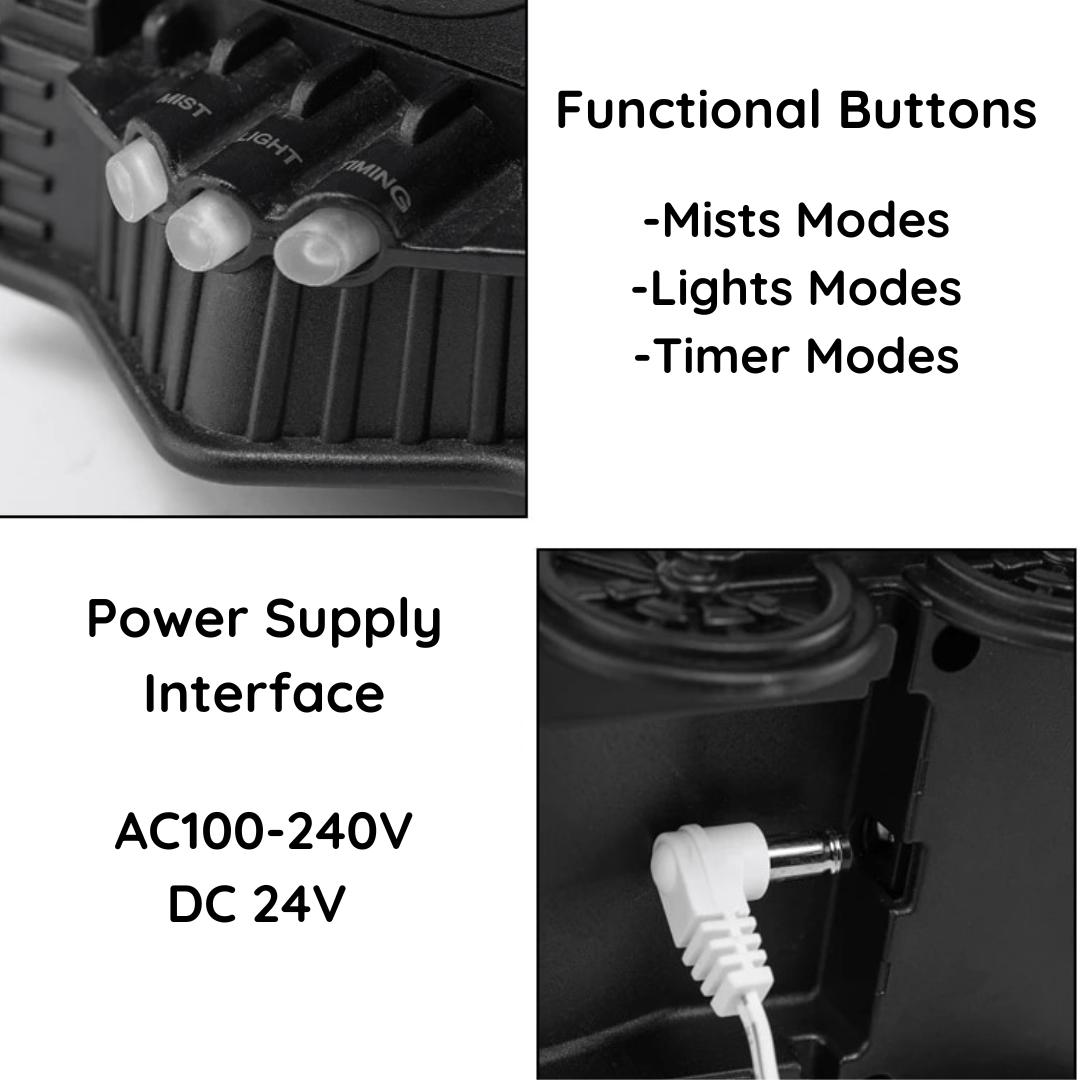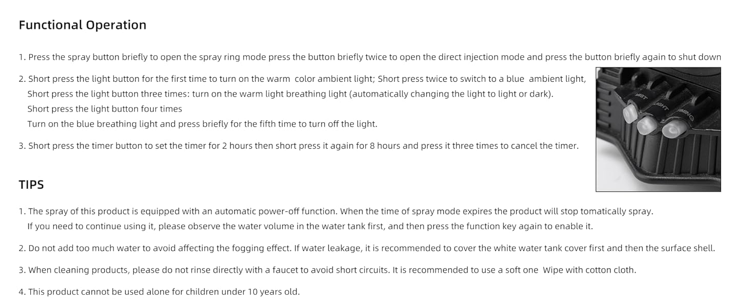 - The spray of this product is equipped with an automatic power-off function. When the spray mode time is up, the product will automatically stop spraying. If you want to continue using it, please first observe the amount of water in the water tank, and then press the function button again to enable it.