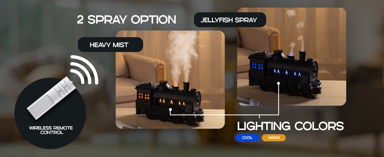 - TRAIN DIFFUSER: This cool steam train diffuser looking mist humidifier with 300ml capacit, train humidifier can work for a long time of 12 hours without frequent water addition. Has two spray modes,spitting circle mode and smoke mode and remote control, as well as a safety auto-switch that prevents it from overheating in case it runs out of water.