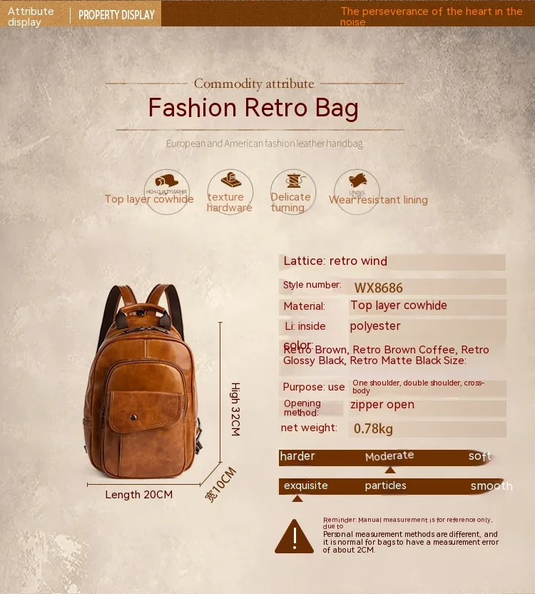 practicality. Crafted from high-quality first-layer cowhide leather, this bag exudes sophistication and durability, ensuring it withstands