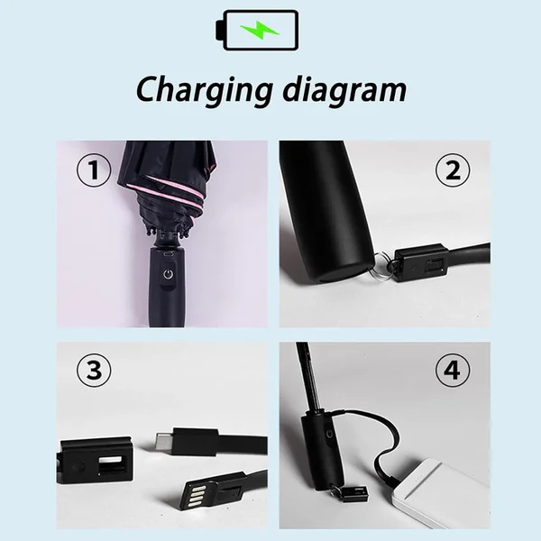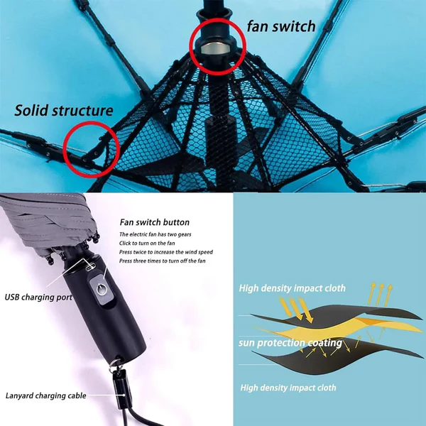 - Stay Cool Anytime, Anywhere - Powered by a USB-C rechargeable 3000mAh lithium-ion battery, the umbrella with fan offers cooling comfort without constant battery replacements (charging cable included).