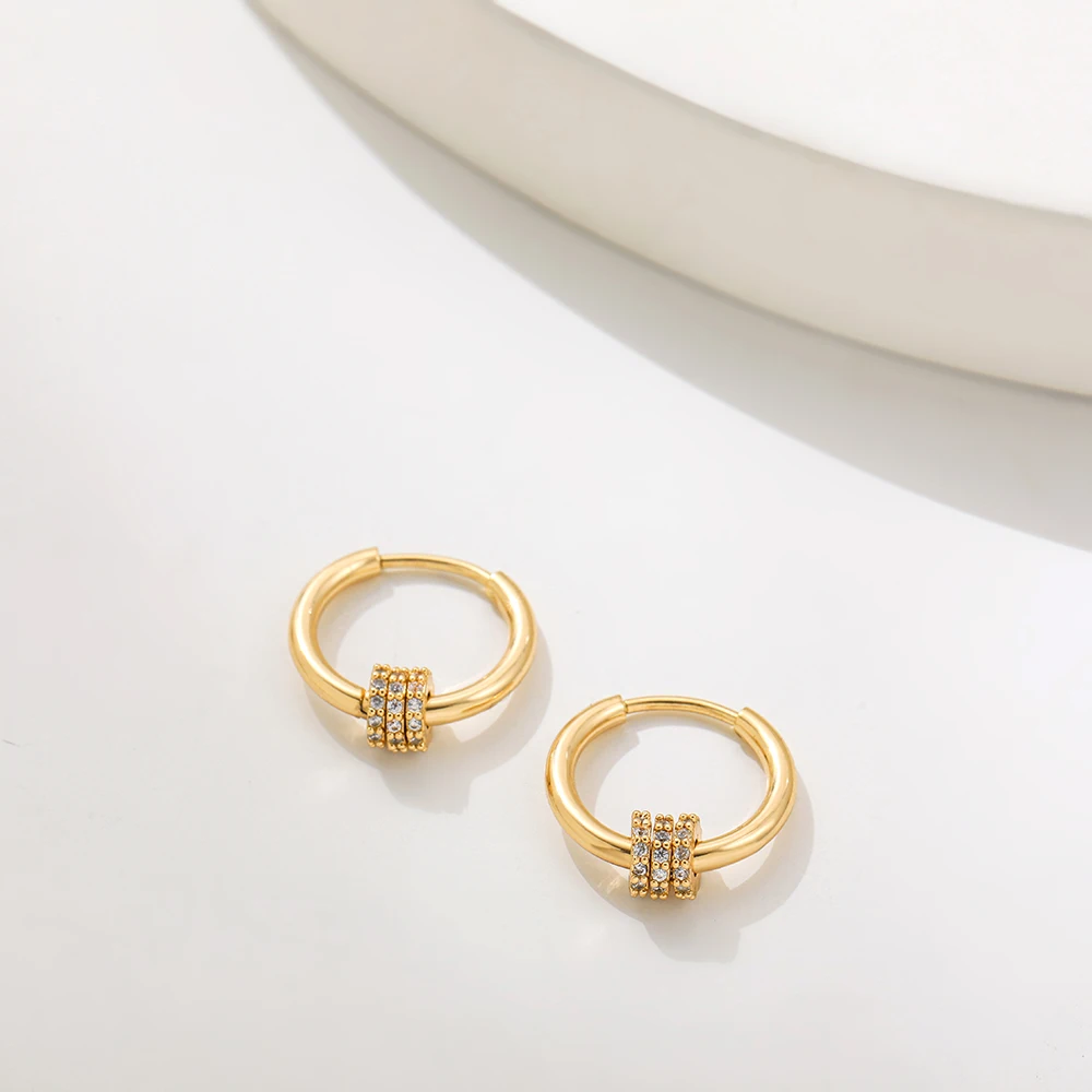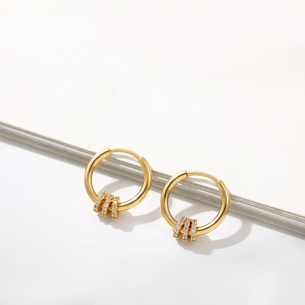 Add an edgy yet elegant touch to your jewelry collection with the Trendy Small Round Gold Color Stainless Steel Huggies Hoop Earrings. Featuring sparkling zirconia CZ stones and a unique triple gear charm design, these earrings are the perfect accessory for those who love fashion-forward, luxurious jewelry. Their small hoop style and lightweight construction make them ideal for both daily wear and special occasions.