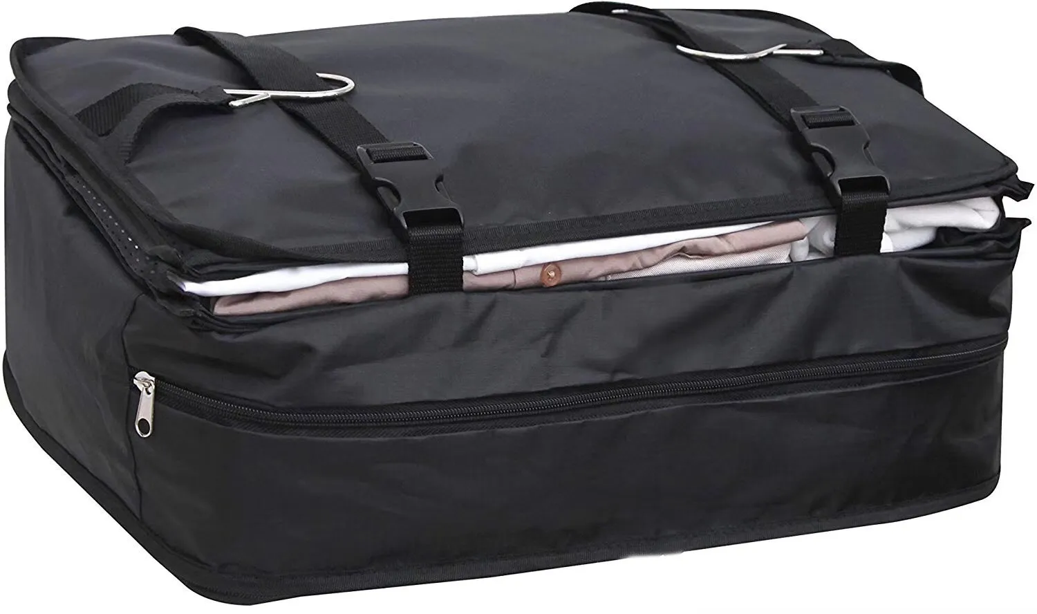 - The three-layer design of the bag offers ample space to store multiple clothing items, such as shirts, pants, dresses, and accessories, keeping them neatly organized and wrinkle-free. The layers are designed to help you categorize your clothes by type or outfit, making packing and unpacking a breeze.