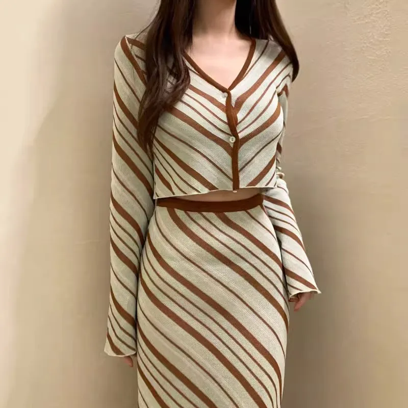Crafted from soft, stretchy knitwear, this set is designed to provide a flattering fit that hugs your curves while offering flexibility and ease of movement. The high-waisted skirt elongates the legs and accentuates the waist, creating a balanced, feminine silhouette. Available in various colors and patterns, this two-piece suit is both versatile and timeless, making it a must-have for any fashion-forward wardrobe.