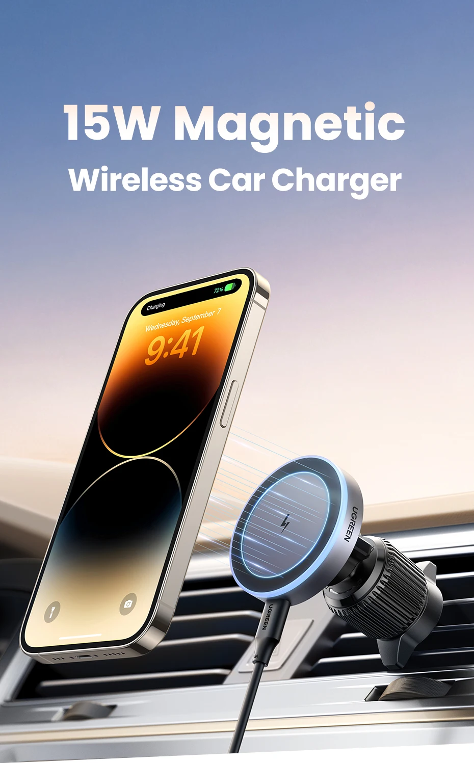 UGREEN Magnetic Car Phone Holder Wireless Charger Stand for iPhone 15, 14, 13 Pro Max