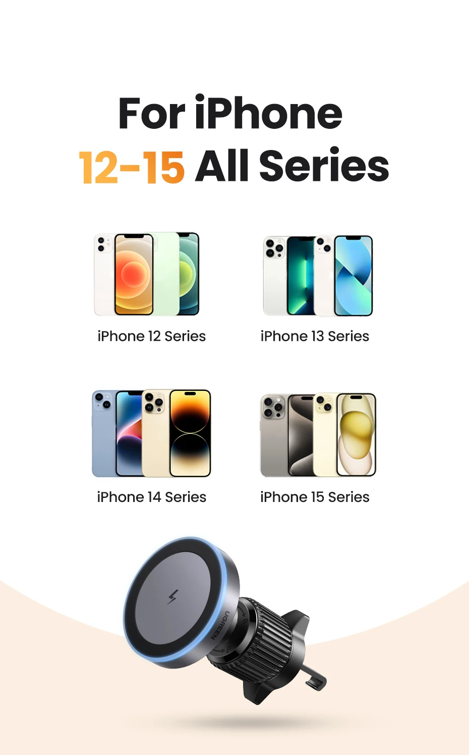 The UGREEN Magnetic Car Phone Holder Wireless Charger Stand is a versatile and efficient charging solution designed for the latest iPhone models, including the iPhone 15, 14, and 13 Pro Max. Combining the convenience of a car phone holder with the power of a wireless charger, this device ensures your phone is securely mounted and charged while you drive. With MagSafe compatibility and an LED light for easy use, this charger stand offers a seamless and practical solution for your charging needs.