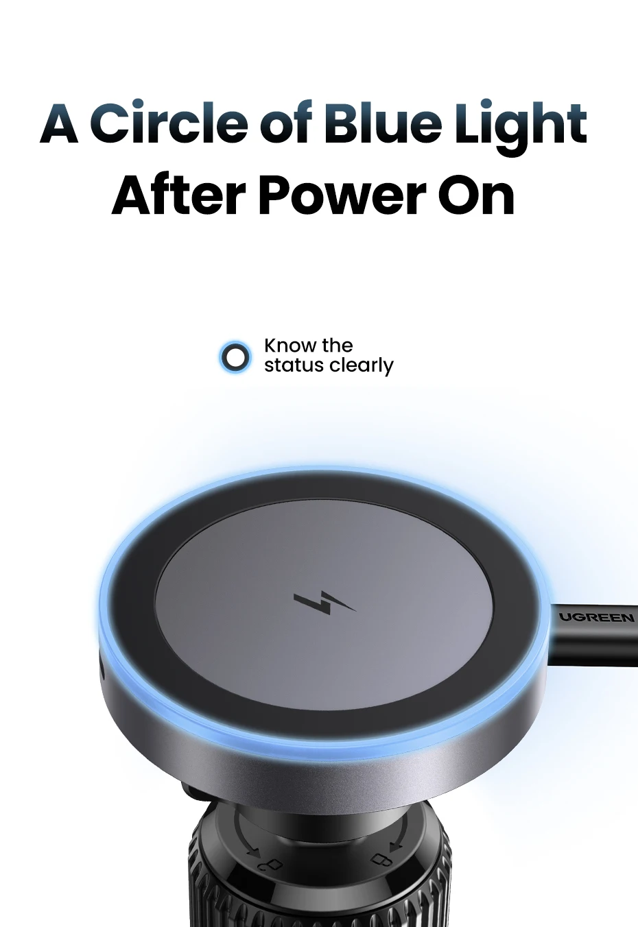The UGREEN Magnetic Car Phone Holder Wireless Charger Stand features a sleek and modern design that complements any car interior. The charger stand is constructed from high-quality materials, providing a premium look and feel. Its compact and lightweight structure ensures it does not obstruct your view, while the strong magnetic surface securely holds your iPhone in place. The LED light adds a touch of elegance and functionality, indicating the charging status and ensuring easy use even in low-light conditions.