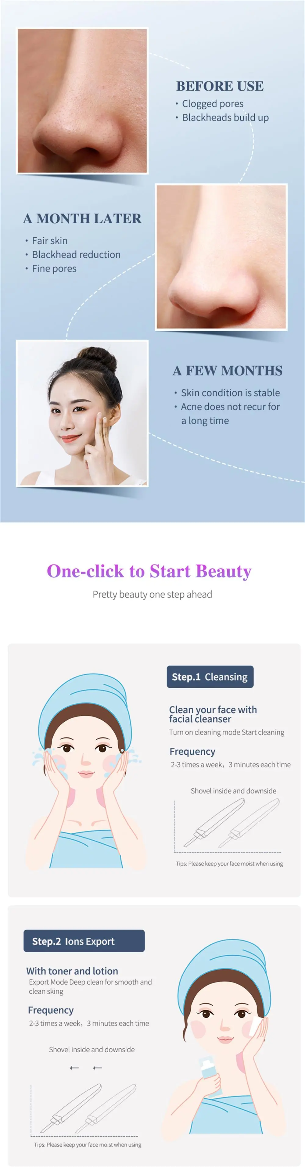 1. Deep cleaning: 45 degree Angle method accelerates epidermal cell metabolism, restores normal renewal rate, promotes aging and shedding of