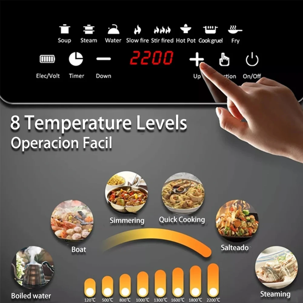 can quickly choose the power you need from 120W to 2200W. This portable induction cooker is perfectly suited for your various cooking needs.