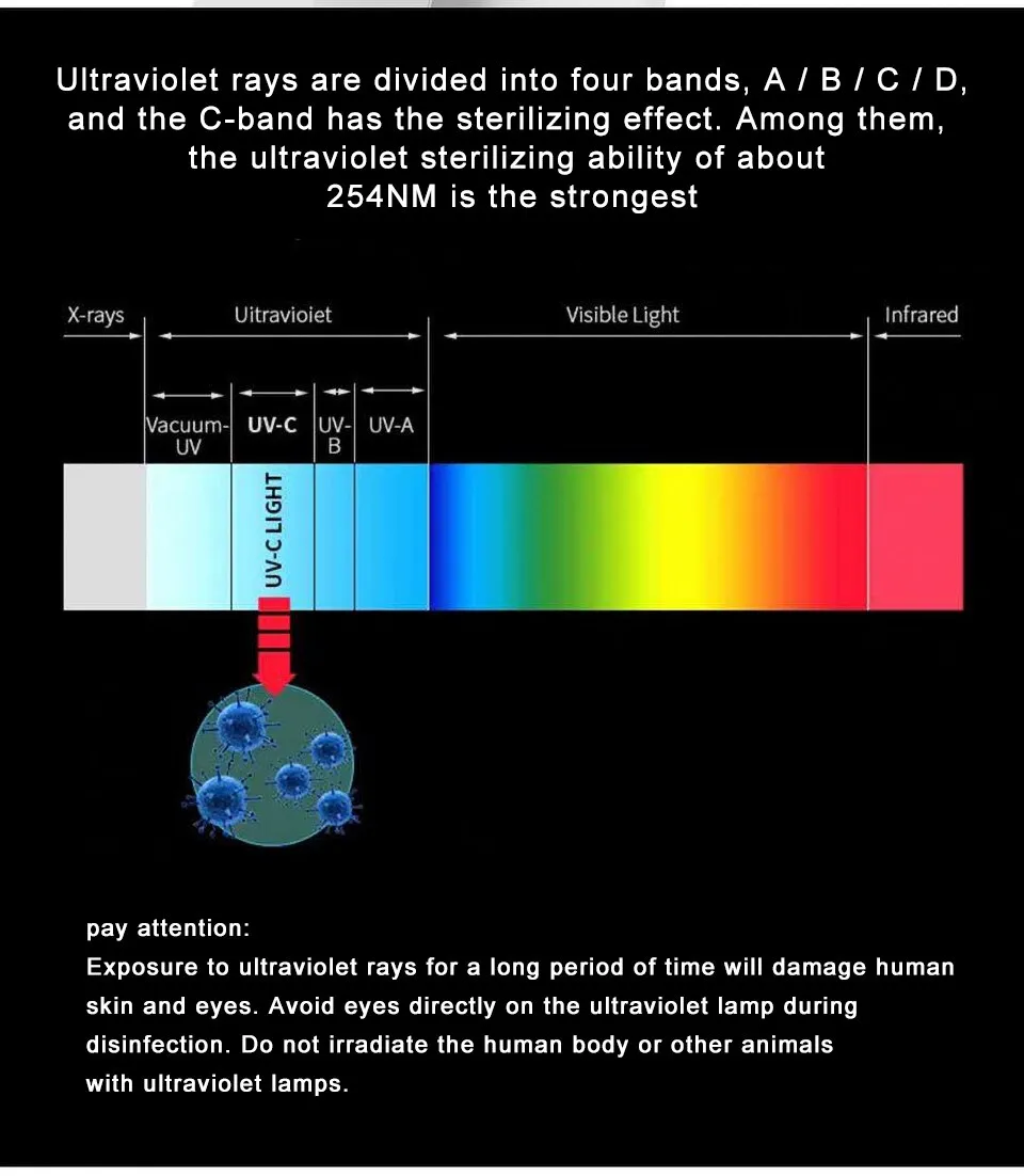 Disinfection method: ultraviolet disinfection UVC (wavelength 200 ~ 275nm)