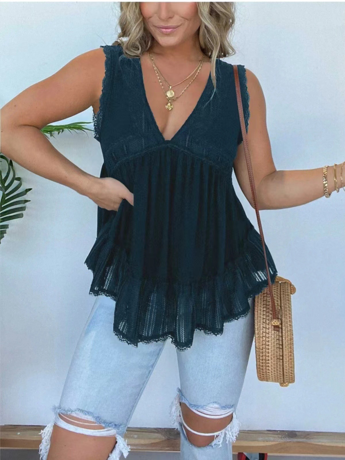 So, why settle for ordinary when you can embrace extraordinary? Elevate your wardrobe with the timeless allure of our Velvet Lace V-neck Top and step into a realm where elegance reigns supreme. It's not just fashion; it's a statement of self-assurance and sophistication.