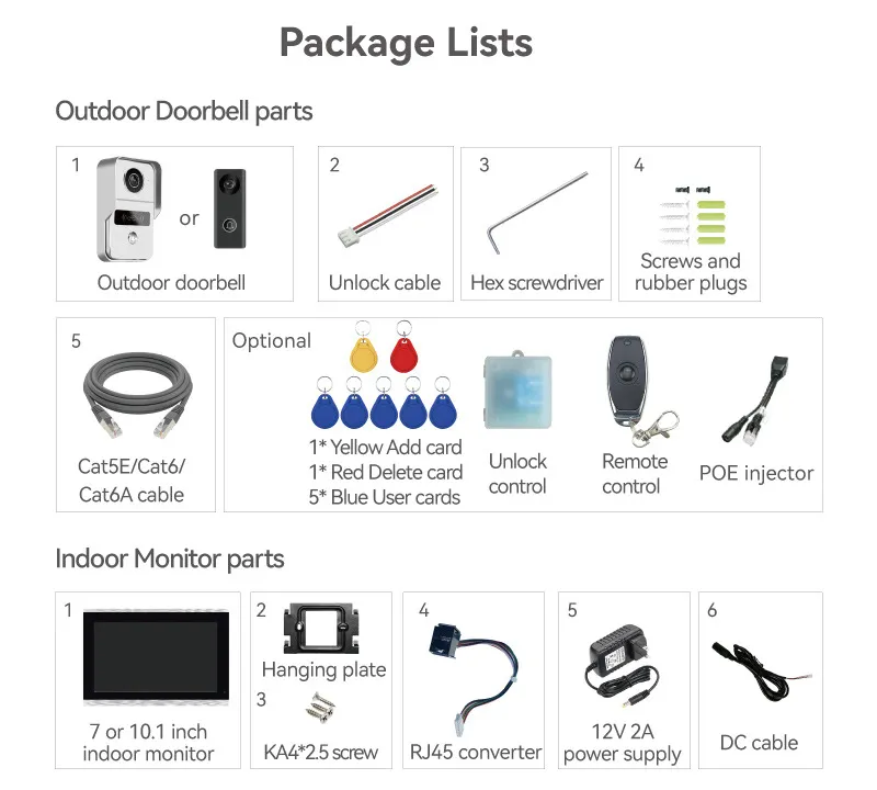 Outdoor doorbell x1 Unlock cable x1 Hex screwdriver x1 Screws and rubber plugs x1 Main engine X1