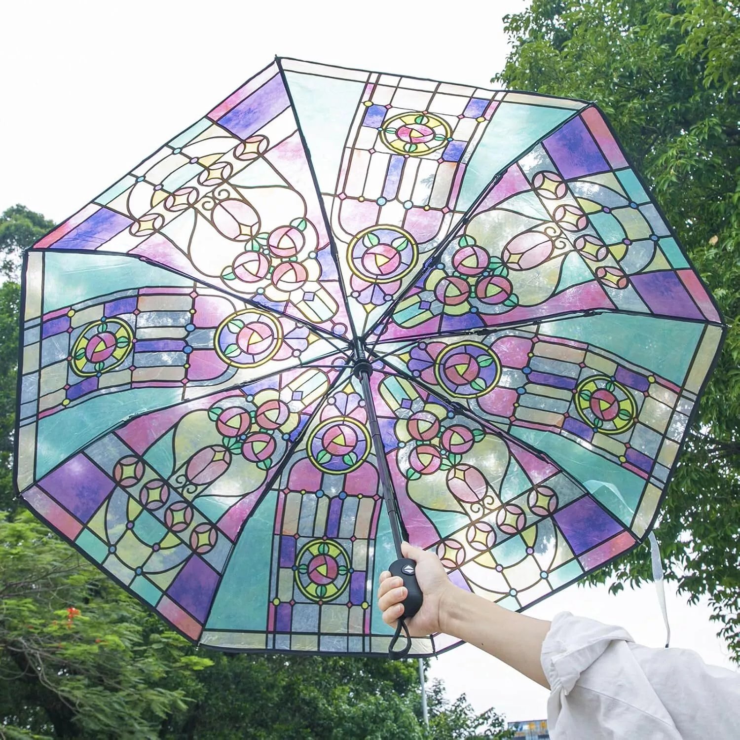 The Vintage Stained Automatic Umbrella features a stunning stained pattern that evokes a sense of old-world charm. The intricate design adds a touch of luxury and sophistication to your everyday essentials. This umbrella is perfect for those who appreciate a vintage aesthetic and want to carry a piece of timeless style, even on rainy days. Its elegant appearance makes it suitable for both casual outings and more formal occasions.