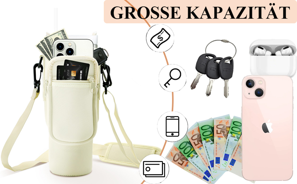 - 【Adjustable Shoulder Strap & Ample Storage Space】: The stanley holder with strap comes equipped with a padded, adjustable shoulder strap, extendable between 29.5" and 59". This versatility caters to various body types for ultimate carrying comfort. Additionally, There are specialized keychains, it features front pockets, perfect for storing essentials like smartphones, cash and cards, offering convenience and functionality for all your adventures.